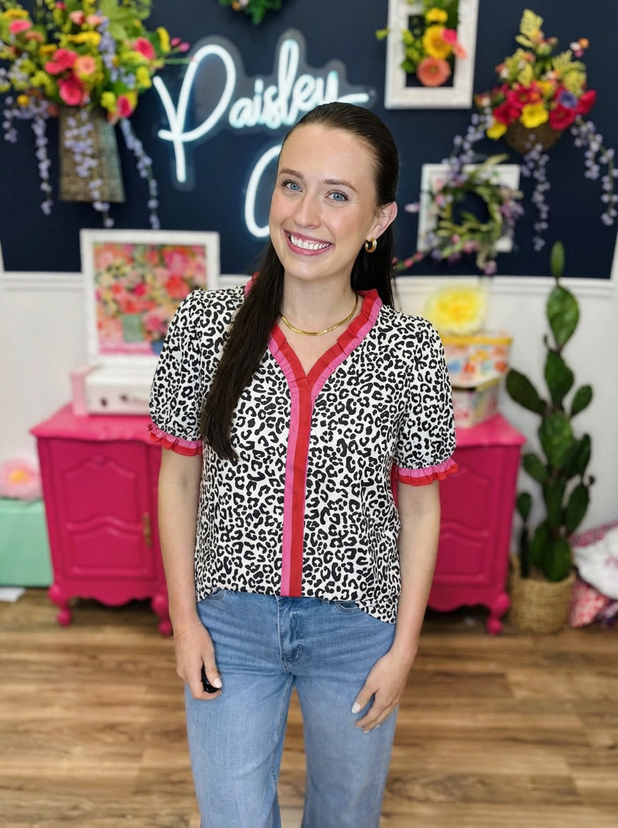 - Ruffled V-Neckline | Shoort Puff Sleeves | Straight Hemline