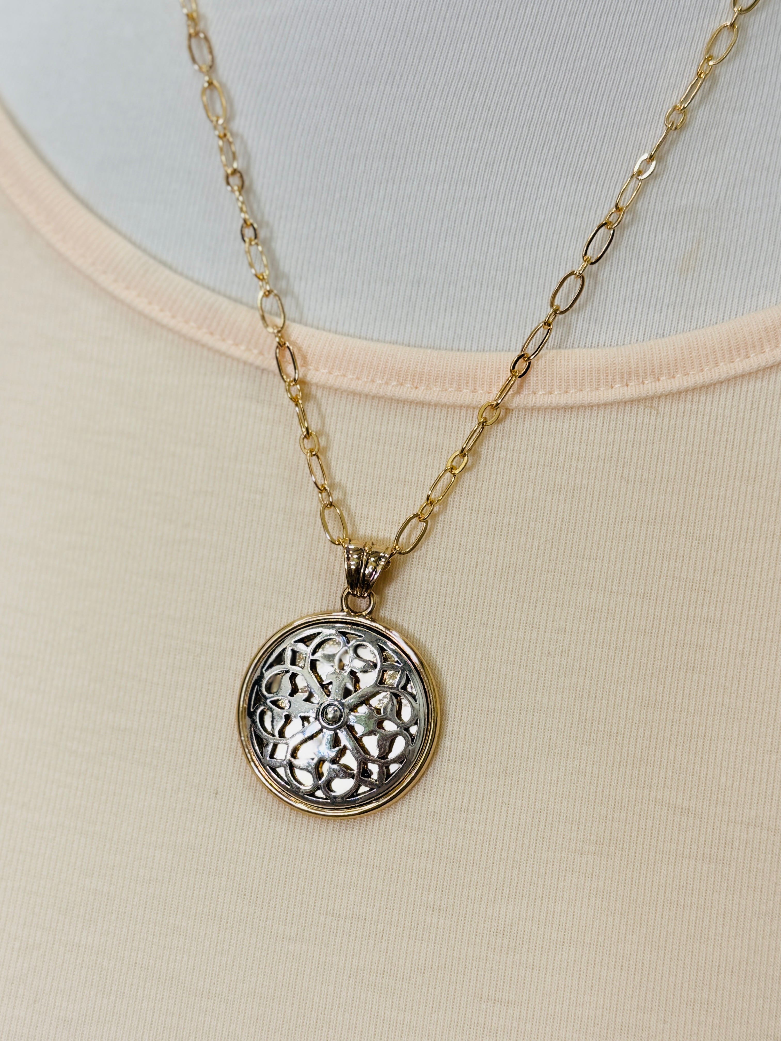 Featuring a gold chain necklace with a round two-tone medallion pendant.