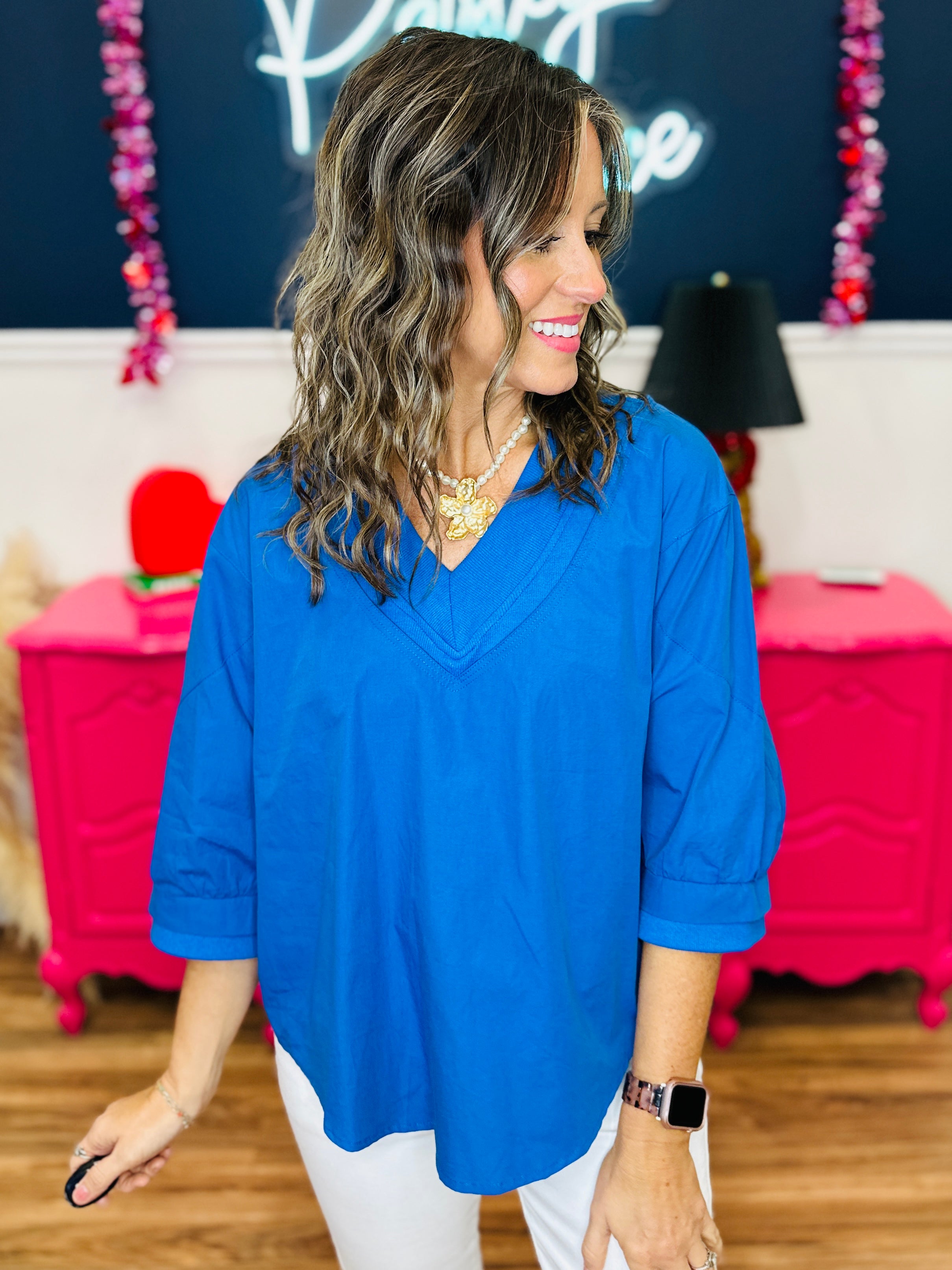 This V-neck top stands out with layered trim detail that gives it a clean, elevated finish. Designed with a relaxed shape and elbow-length puff sleeves, it offers an easy fit that still feels polished. Wear it with denim for daytime plans or style it with dressier bottoms for an effortless evening look.