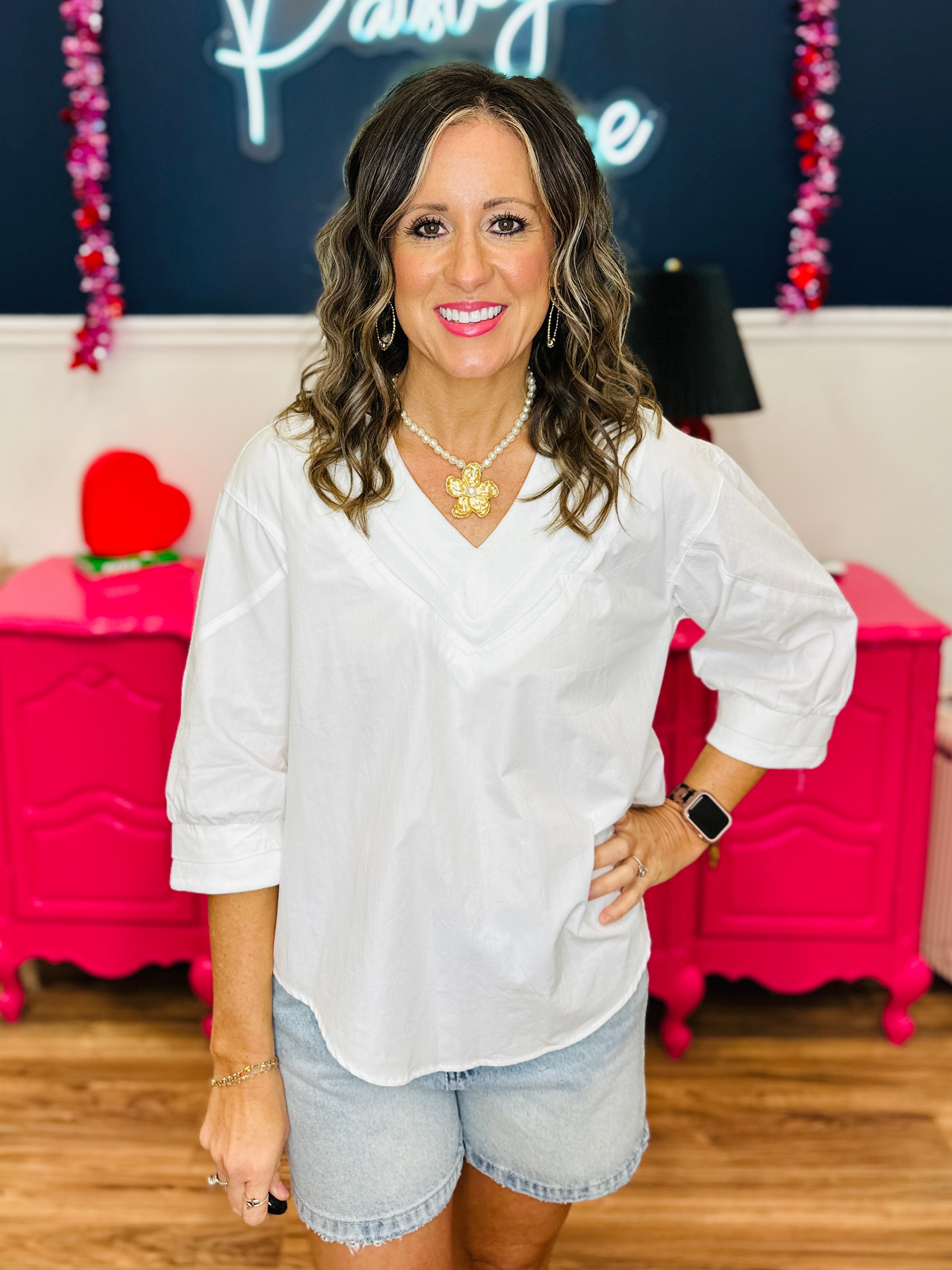 This V-neck top stands out with layered trim detail that gives it a clean, elevated finish. Designed with a relaxed shape and elbow-length puff sleeves, it offers an easy fit that still feels polished. Wear it with denim for daytime plans or style it with dressier bottoms for an effortless evening look.