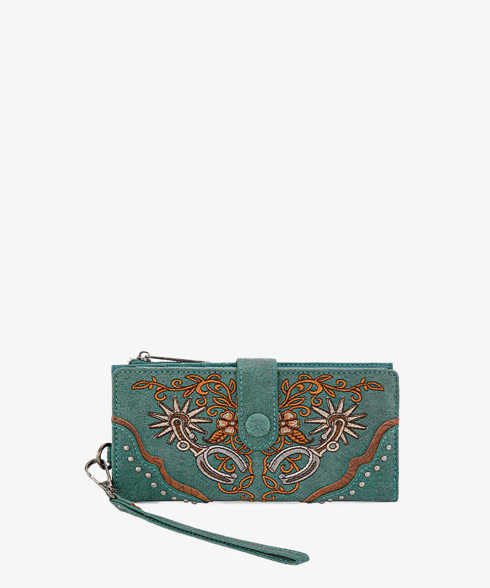 The Montana West wallet is a compact, Western-style embroidered wallet crafted from durable synthetic leather. Featuring intricate floral embroidery and a secure zip closure, this wristlet offers RFID protection for cards and cash.