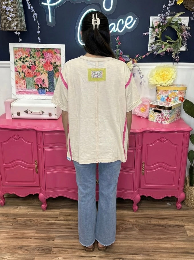 - Ivory w/ Pink, Yellow & Green Patchwork