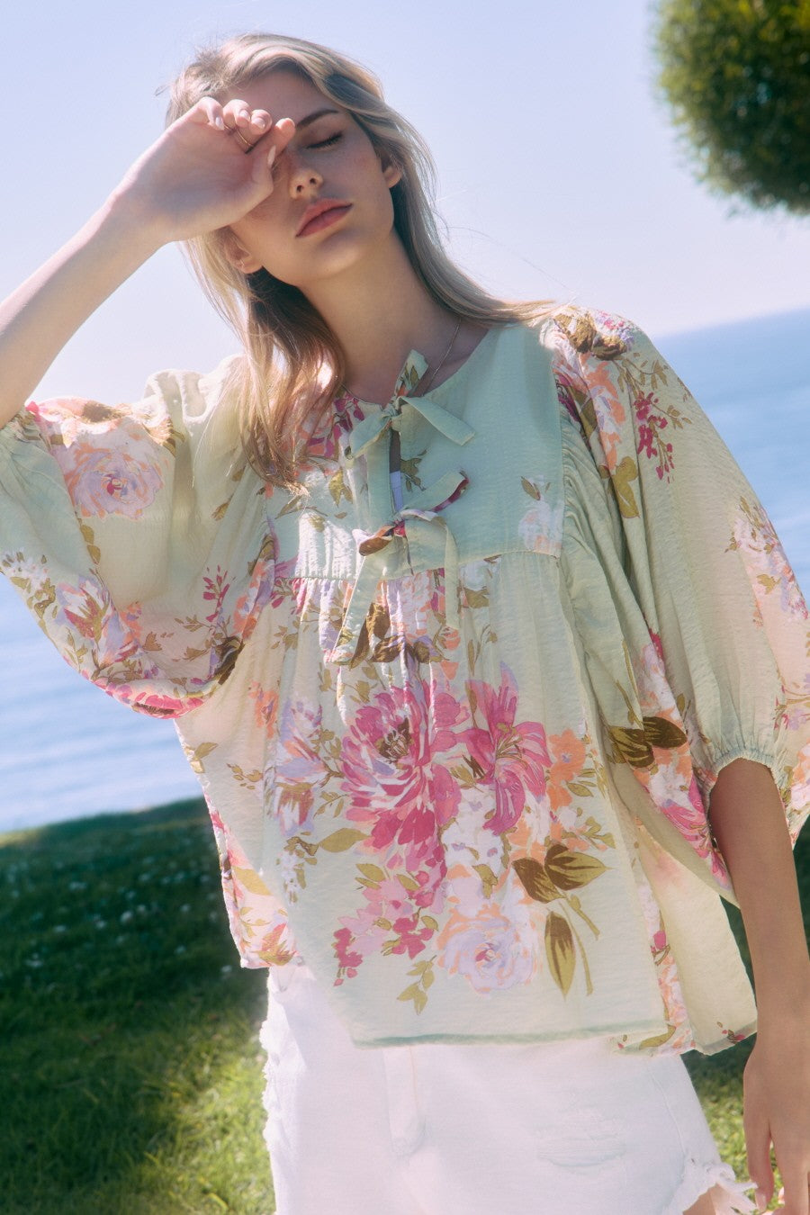 Floral Printed Batwing Sleeve Front Tie Top - Mint Sage Multi
