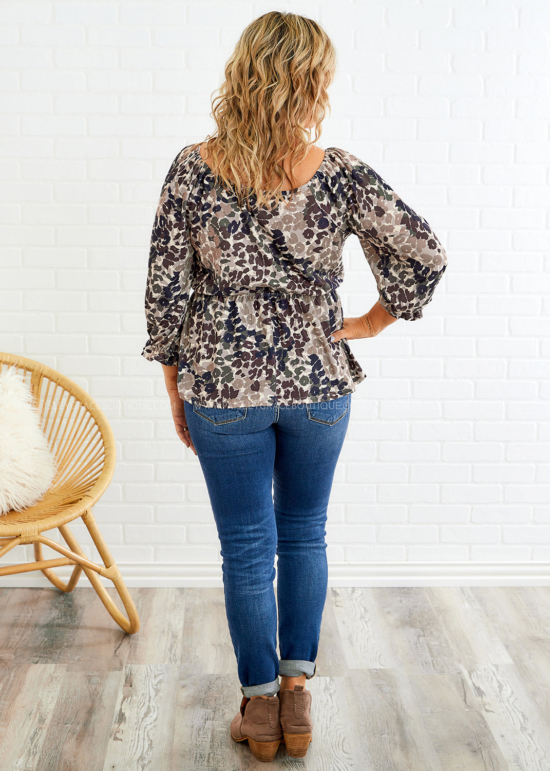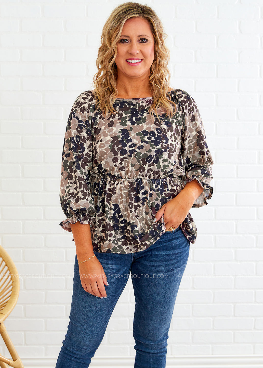 - Scoop Neckline | 3/4 Puff Sleeves w/ Ruffled Trim | Peplum Hemline