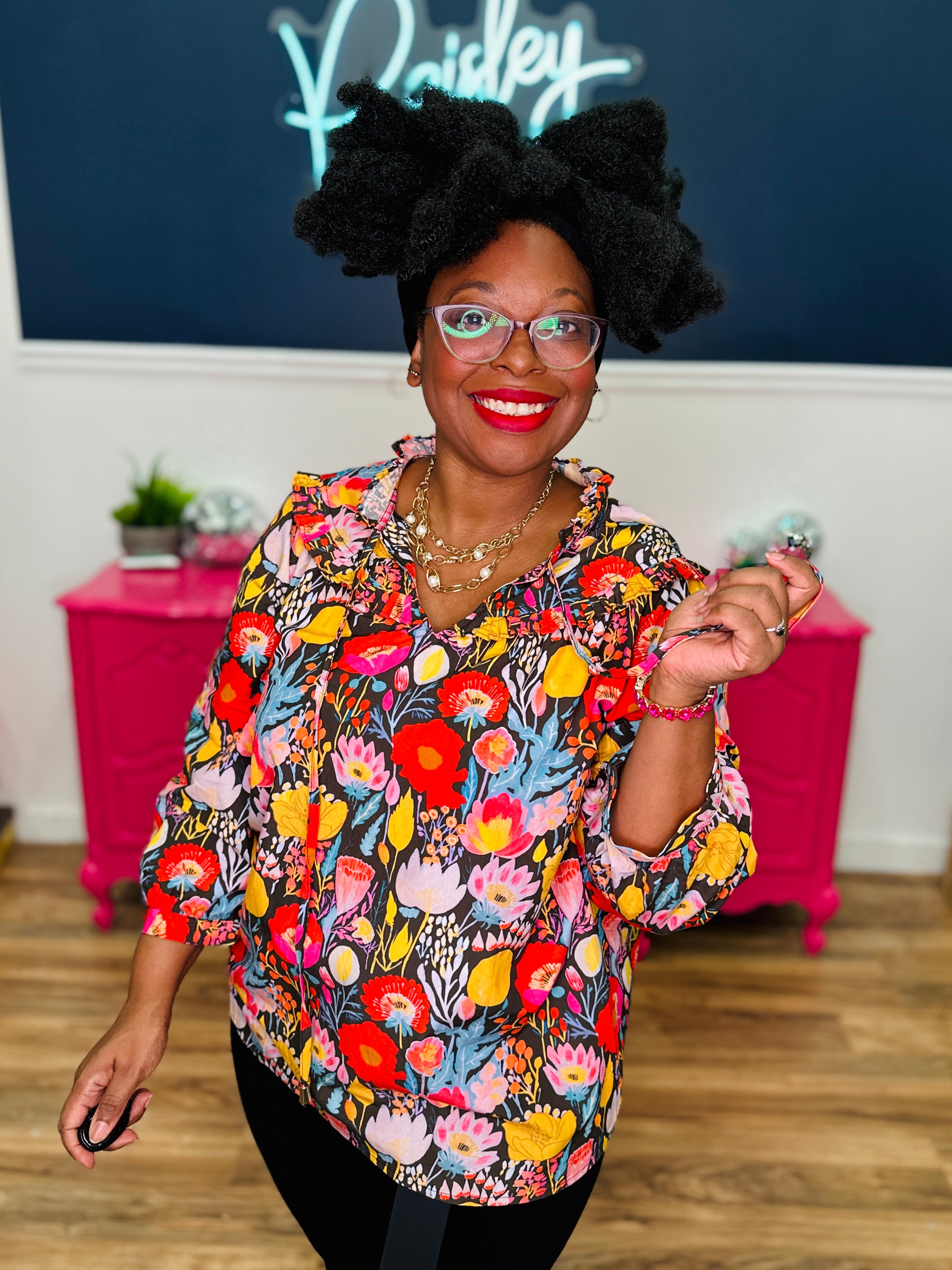 - Ruffled Keyhole Neckline w/ Ties | Full-length Bubble Sleeves | Curved Hemline