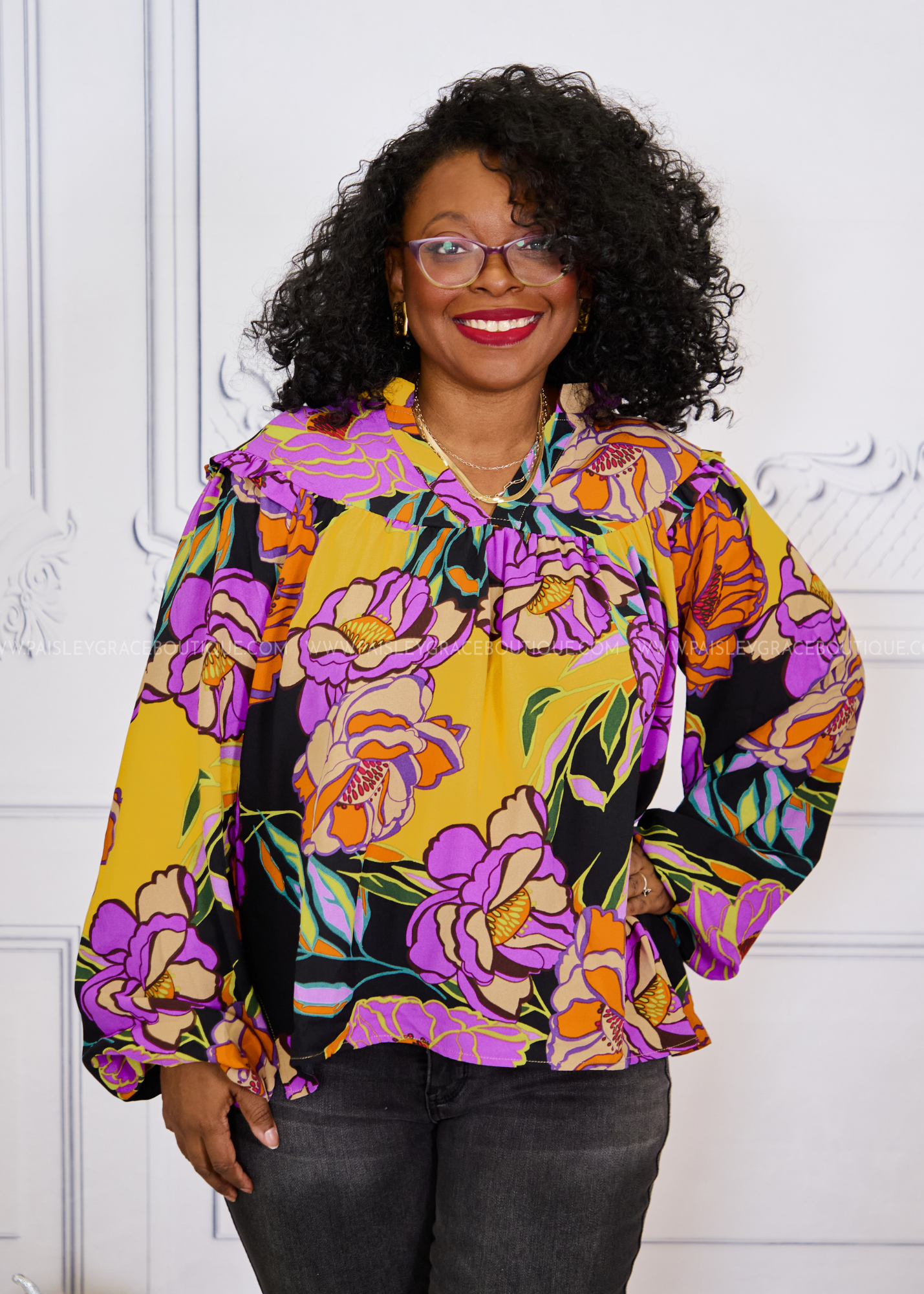 - Ruffled V-Neckline | Full-length Sleeves | Empire Hemline