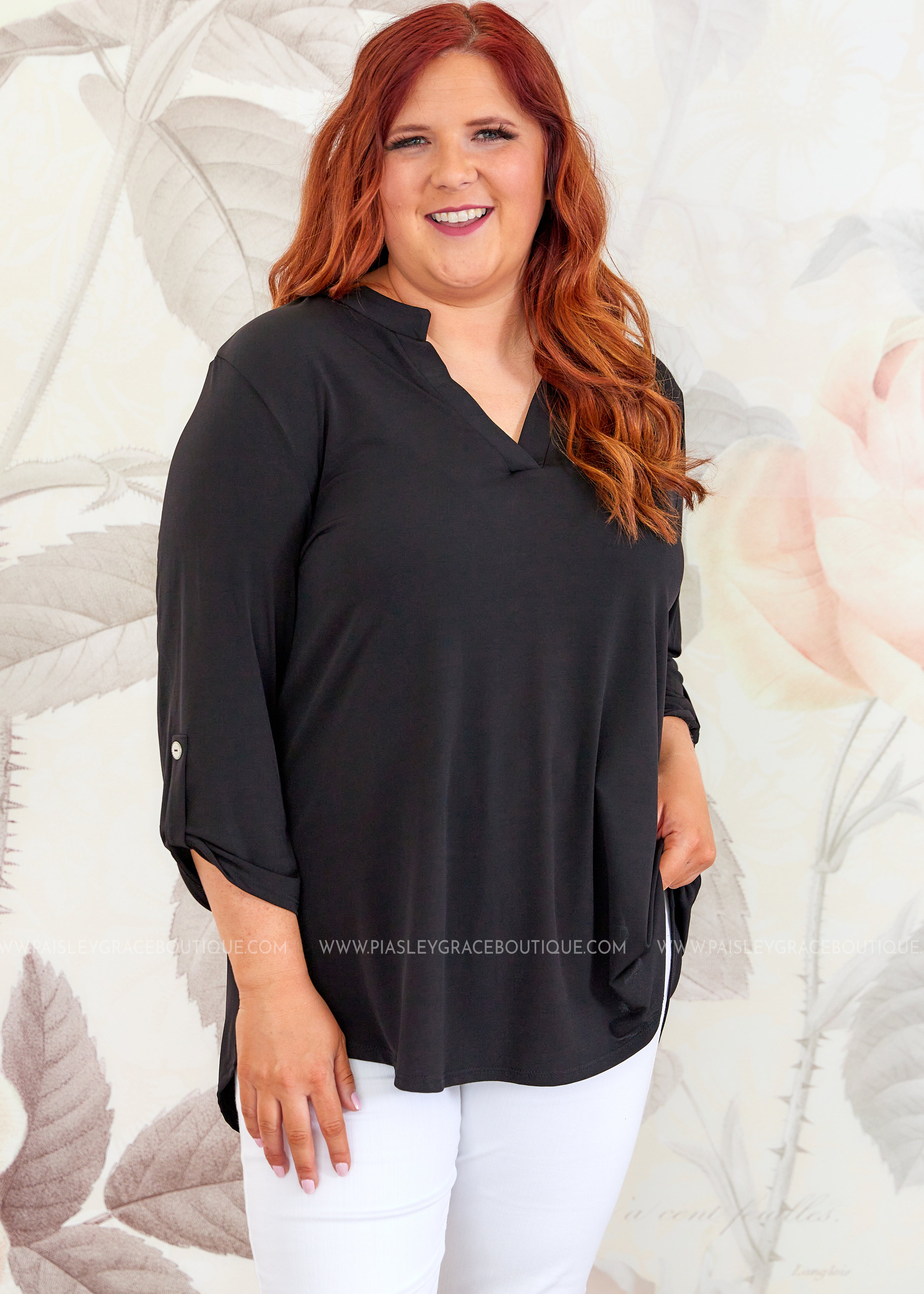 - V-Neckline | Quarter-Length Roll-Tab Sleeves | Curved Hemline