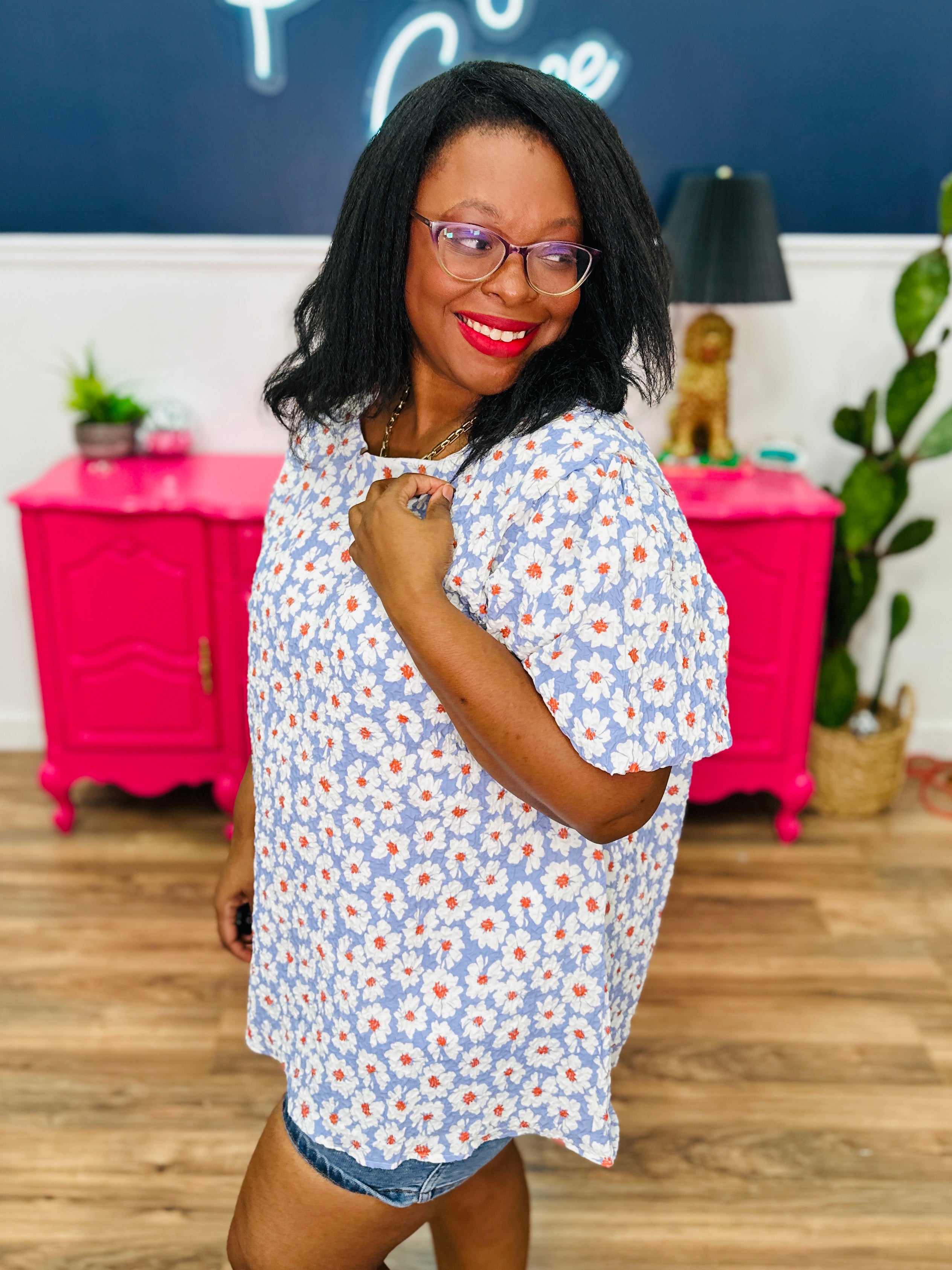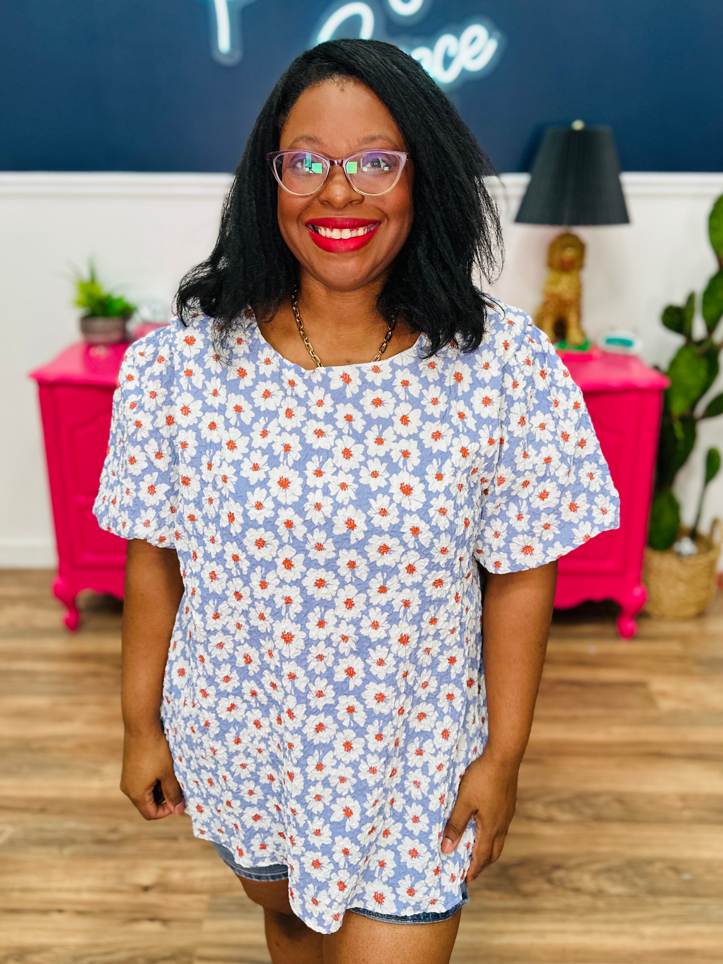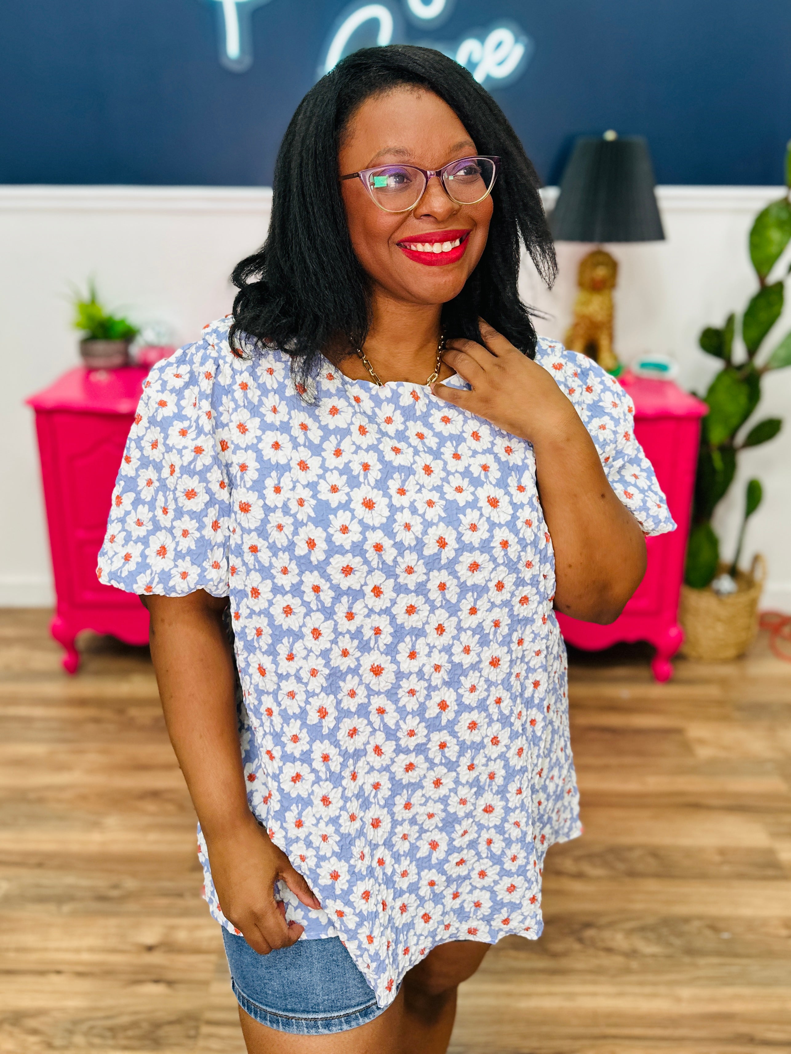 Be the queen of your garden in this textured daisy print puff sleeve top. With its round cut neckline and playful puff sleeves, this top transforms any outfit. Made of textured fabric, this top adds a unique touch to your wardrobe. Perfect for a fun day out!