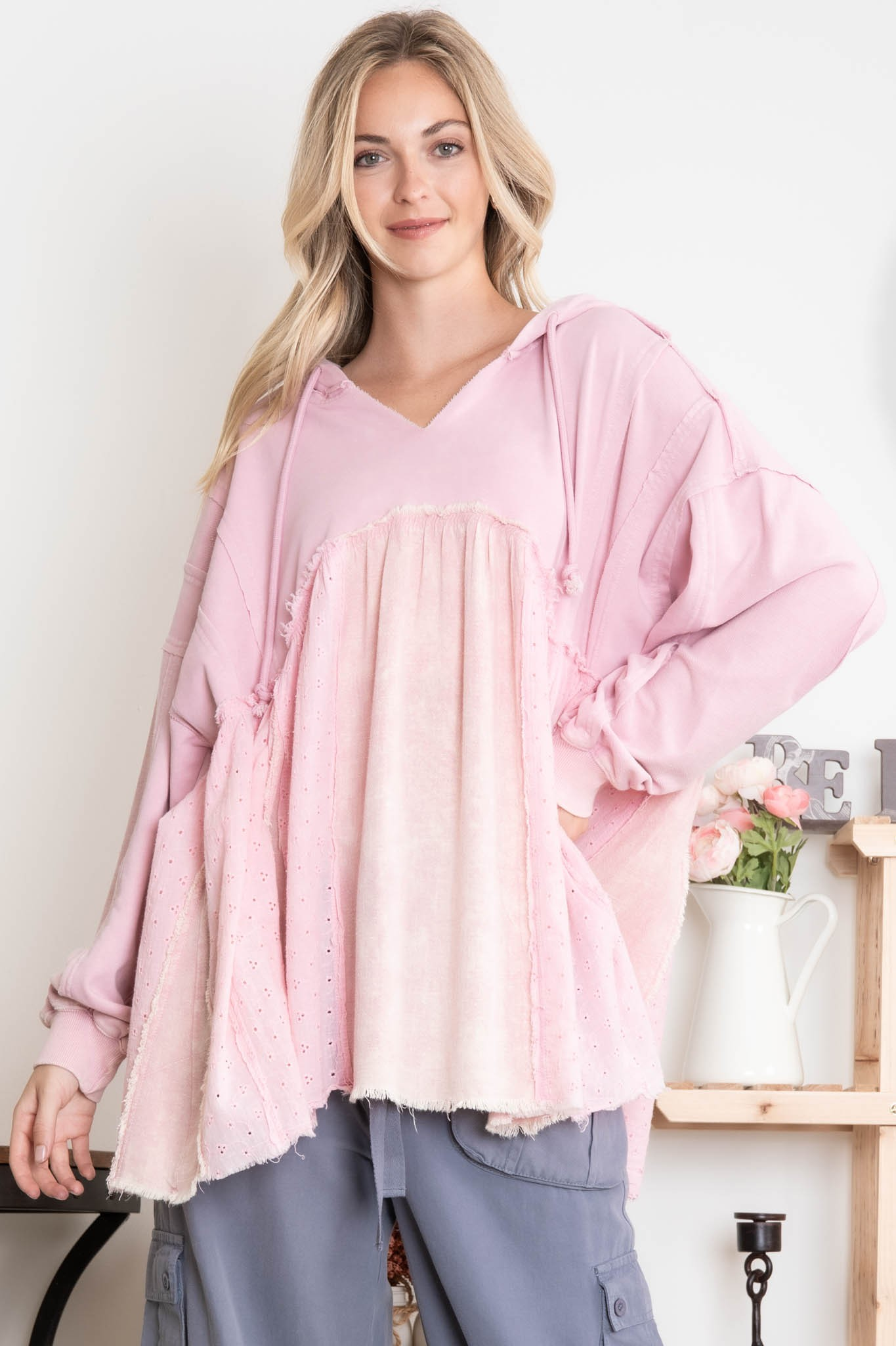 - Hooded Neckline | Full-length Dolman Sleeves | Frayed Hemline