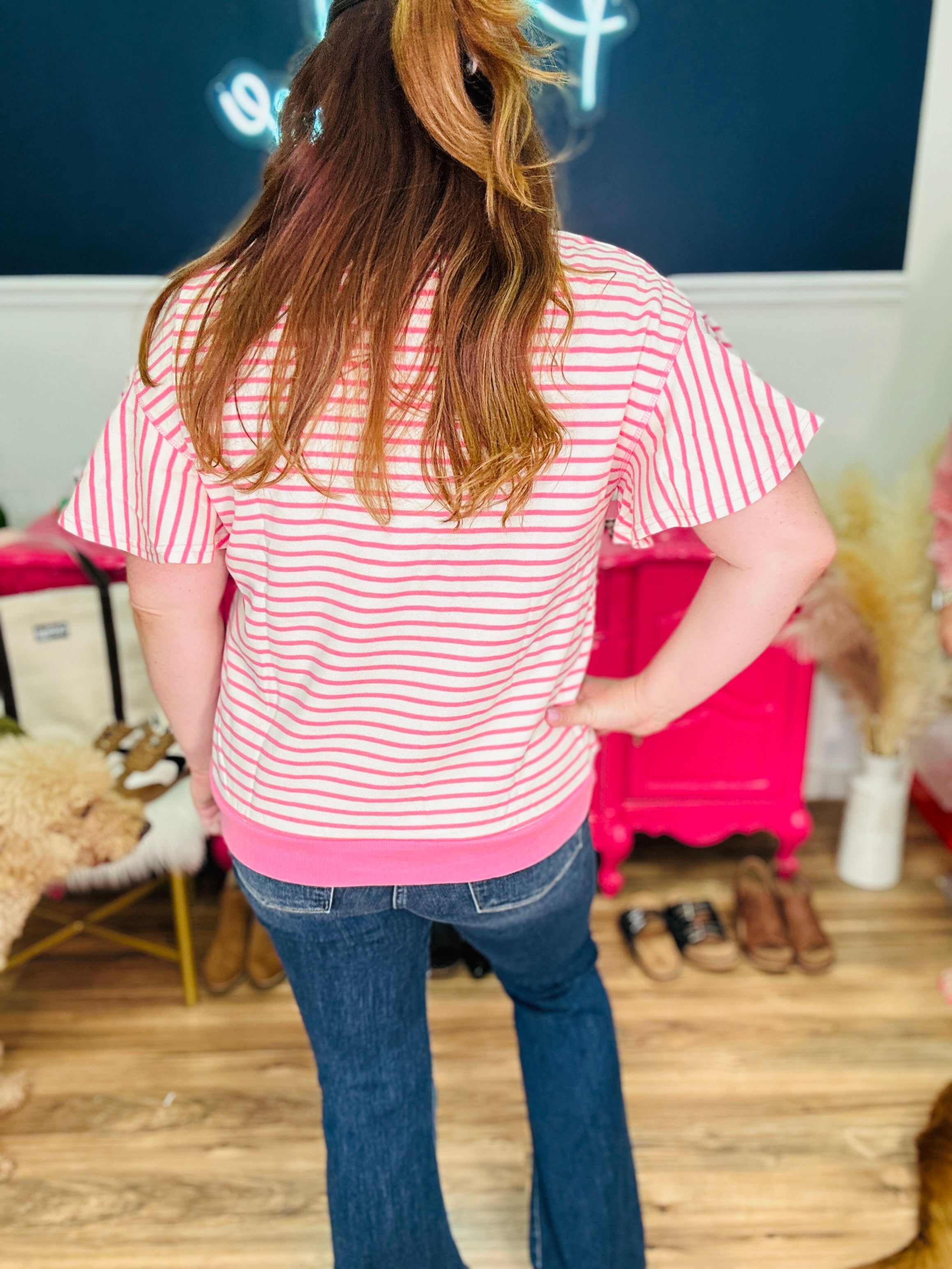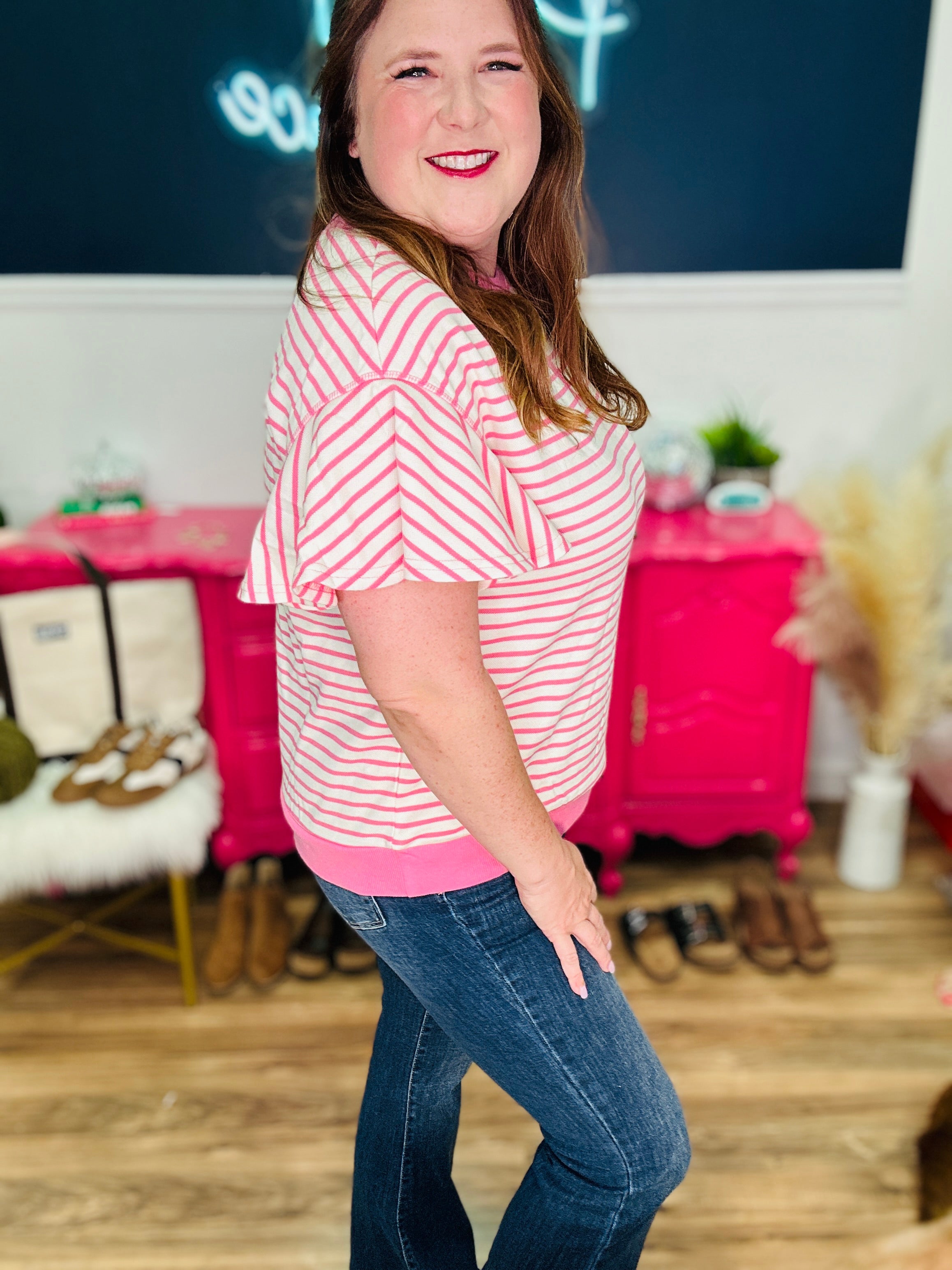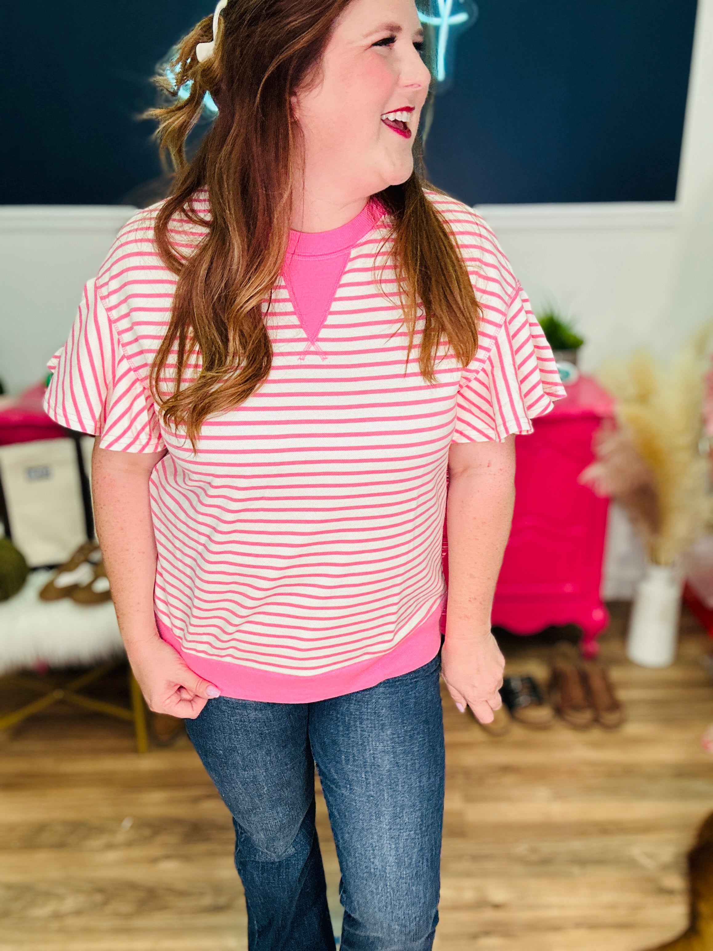 - Round Neckline | Short Ruffle Sleeves | Straight Hemline