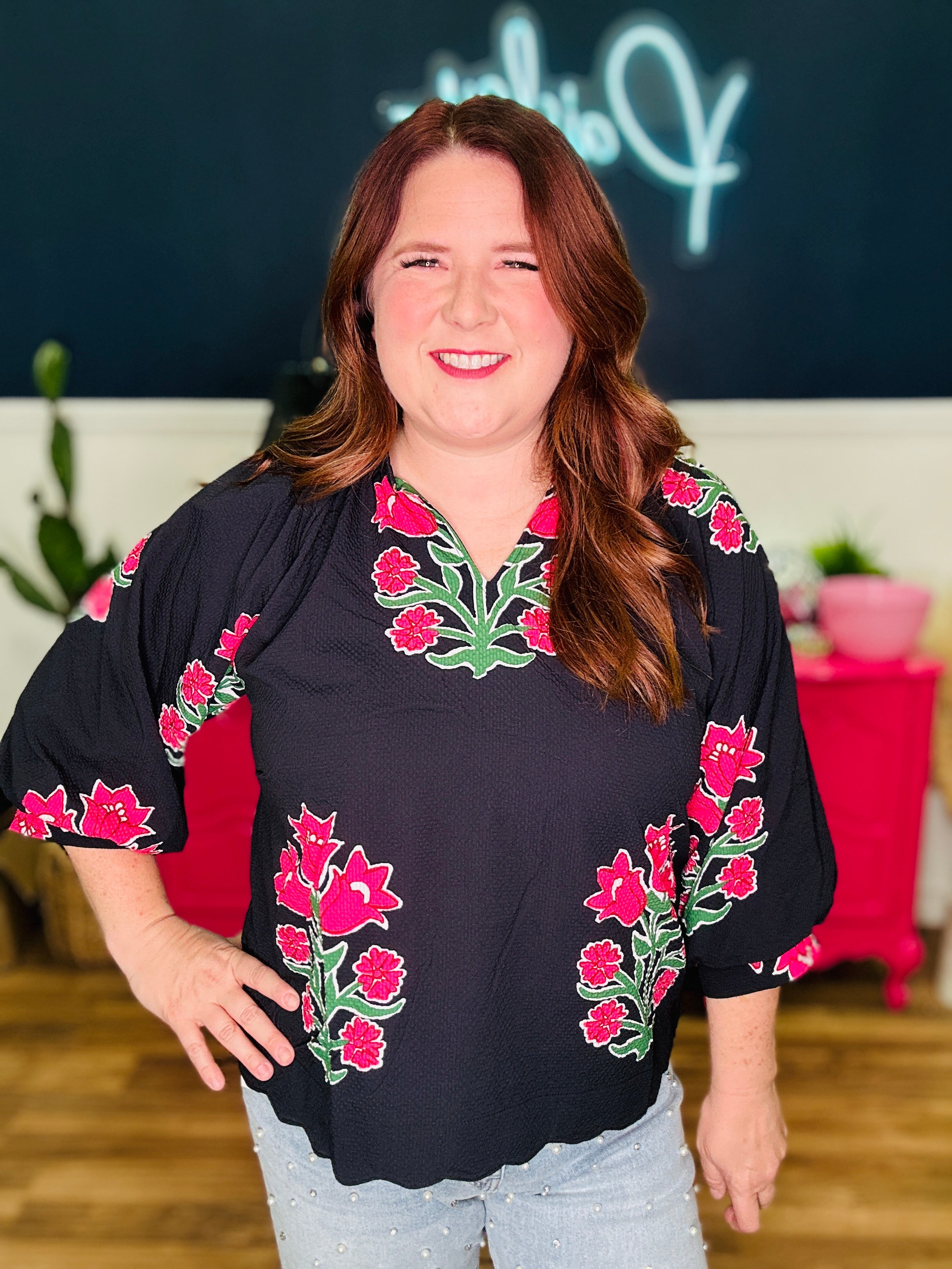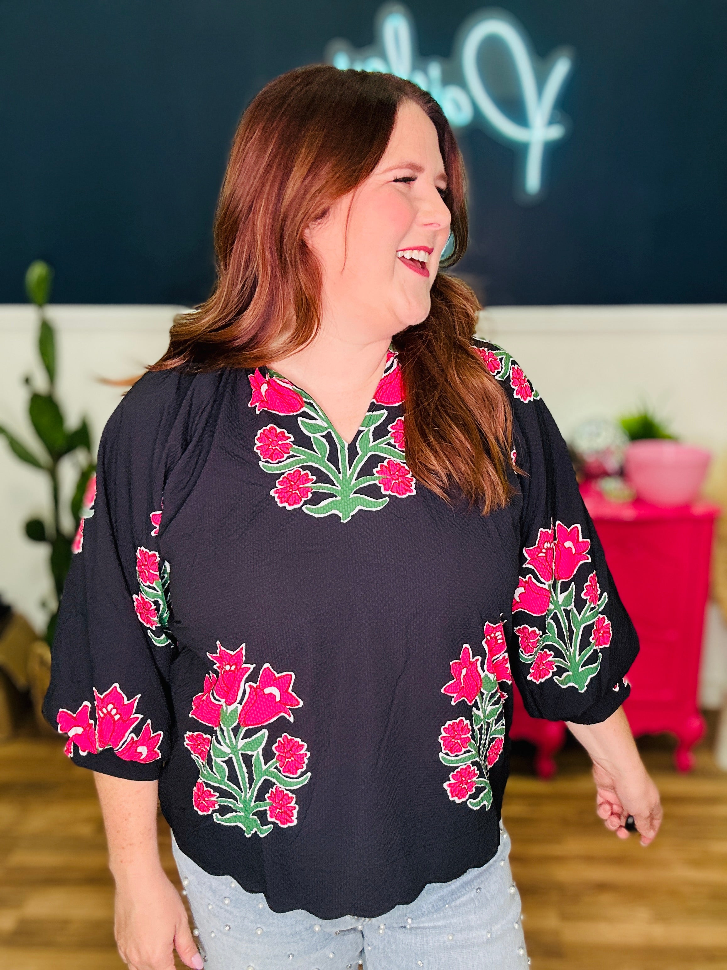 - Split V-Neckline | Mid-length Bubble Sleeves | Scalloped Hem