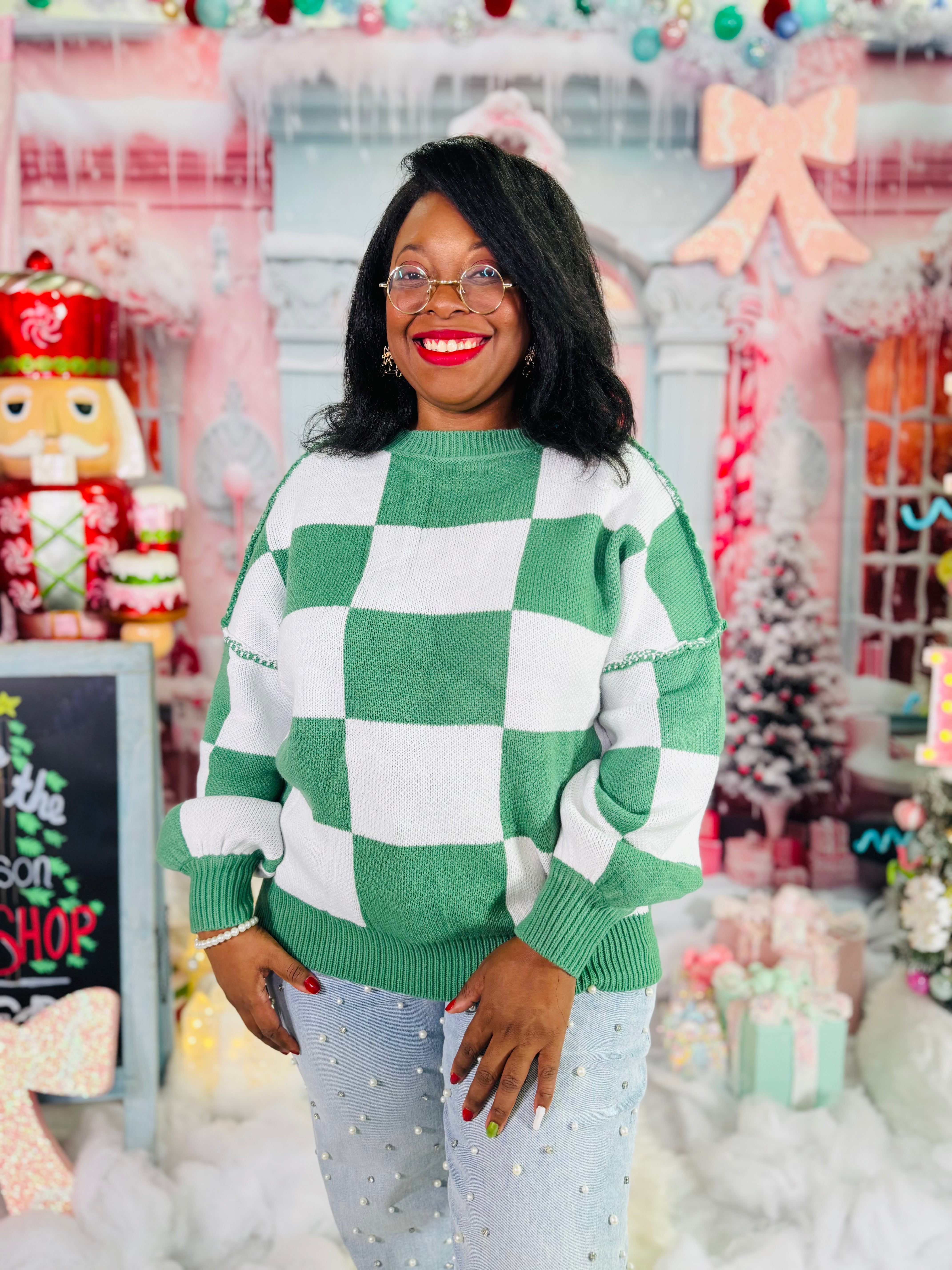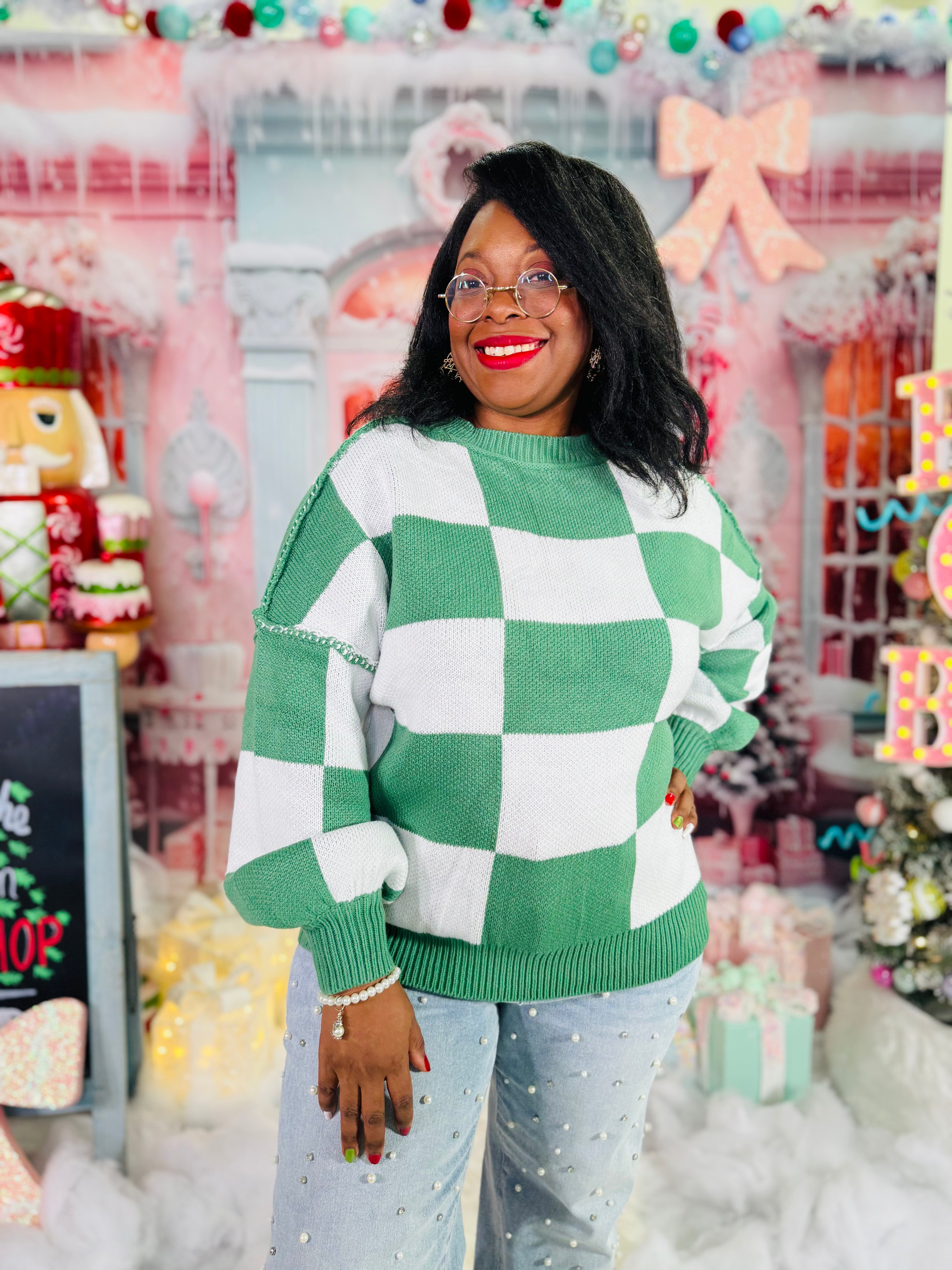 Checkered Bishop Sleeve Sweater - Green - HOLIDAY CHEER