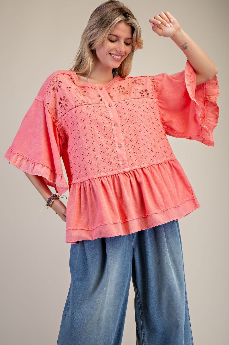 Eyelet Lace Mixed Wash Cotton Slub Top