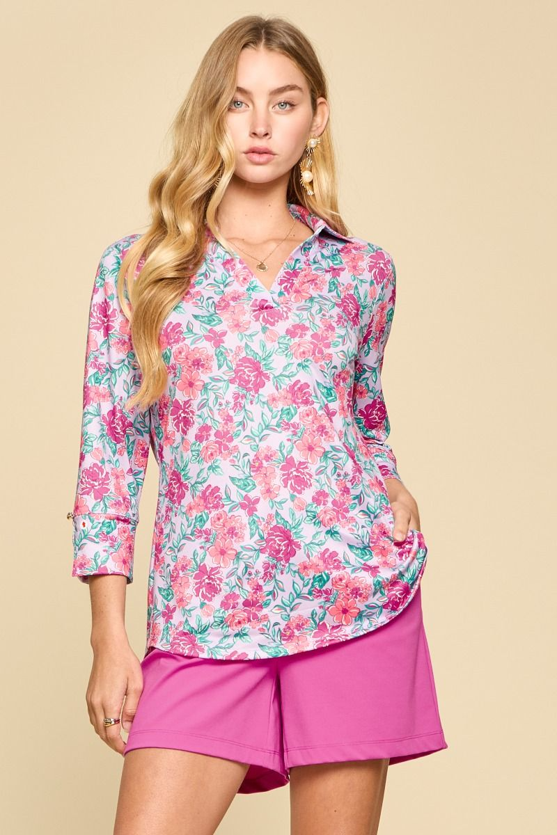 3/4" sleeve blouse made from lightweight sun protective inspired fabric that keeps you cool! It's perfect for days when you want coverage without feeling too warm. The soft, breathable material and relaxed fit make it an effortless choice for both sporty and casual looks-- From the court to brunch and beyond!