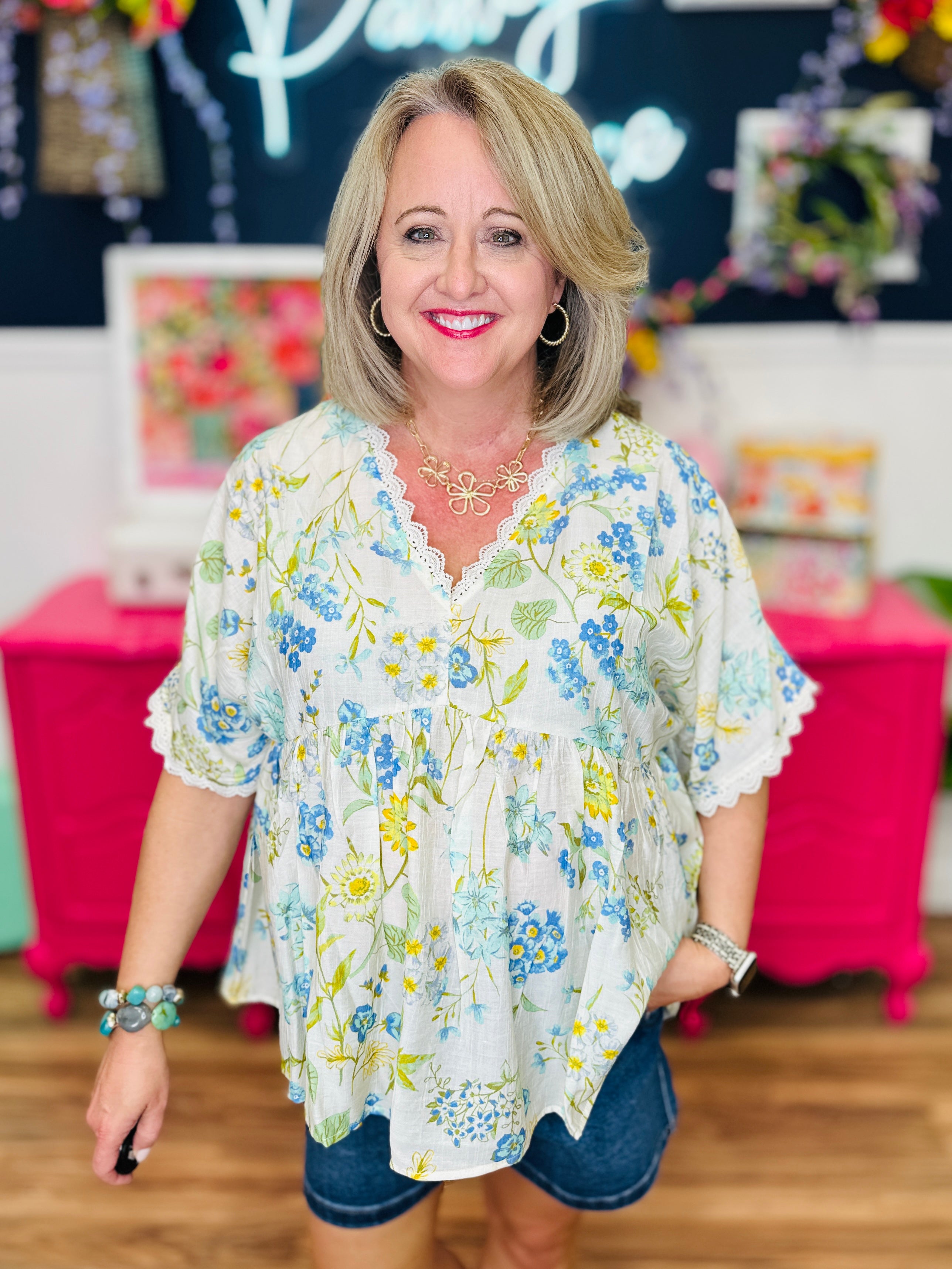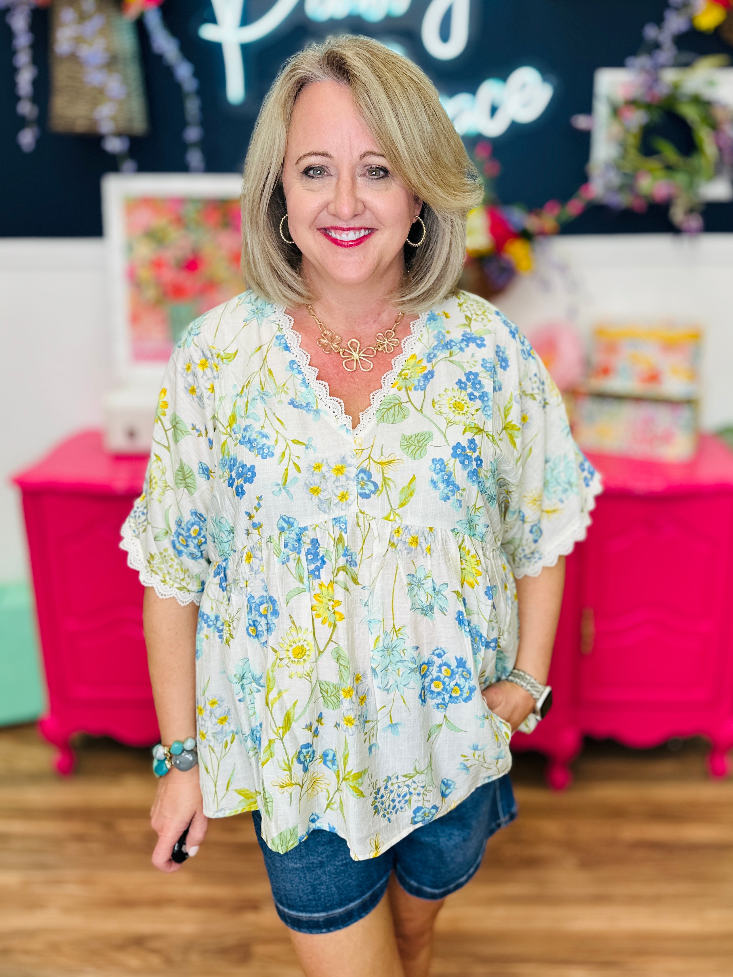 - Ivory, Green & Blue Florals | Lace Trim Details