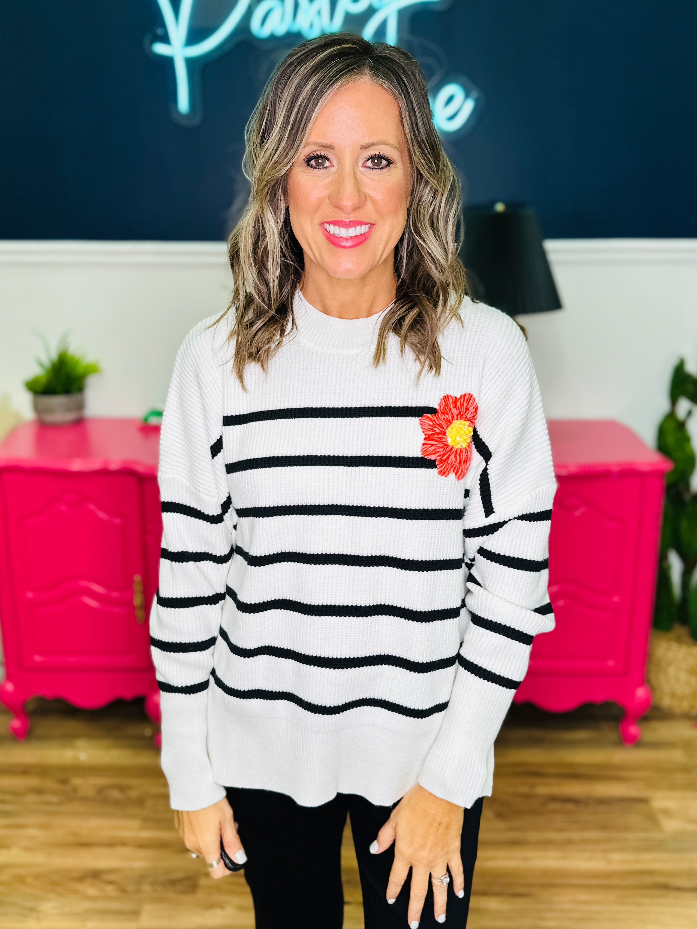 - White w/ Black Stripes | Red Embroidered Flower
