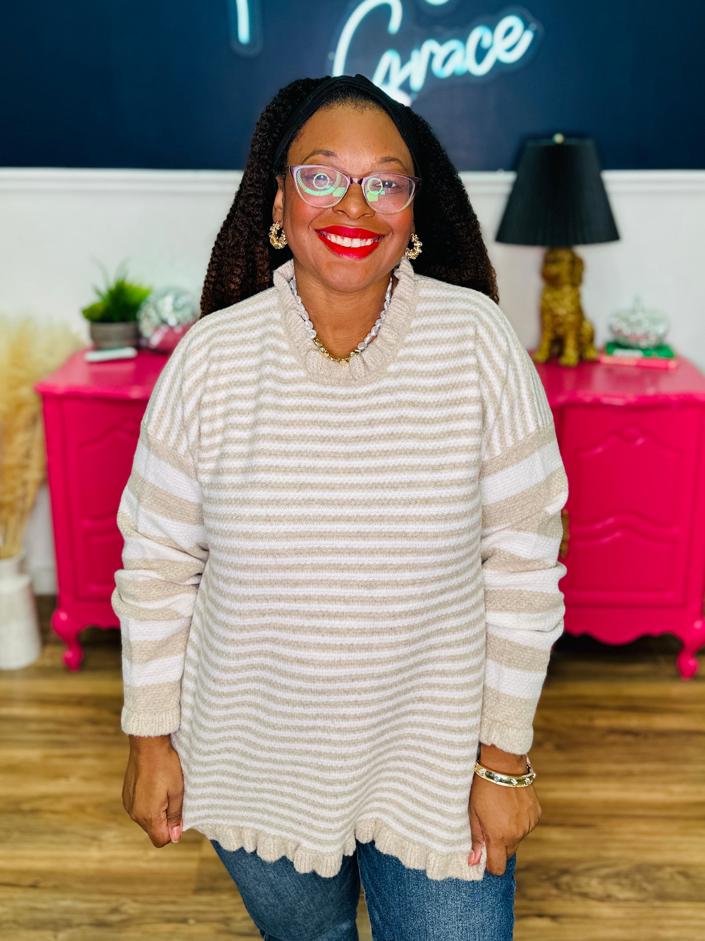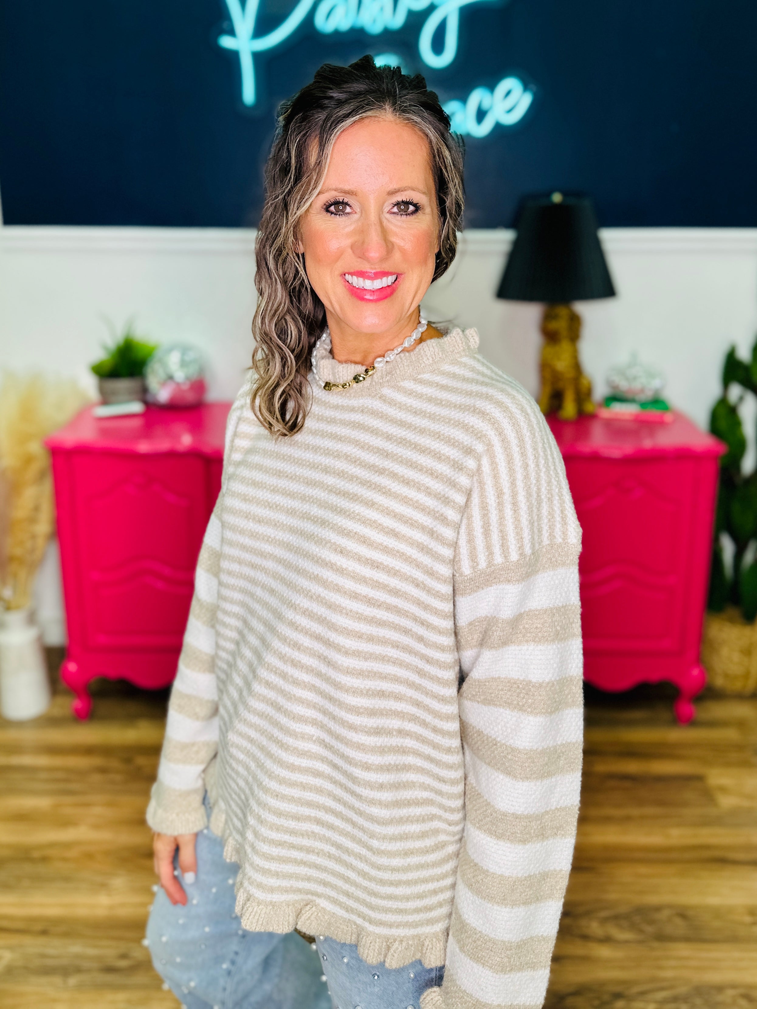 - Ruffled Crew Neckline | Full-length Sleeves | Ruffled Trim