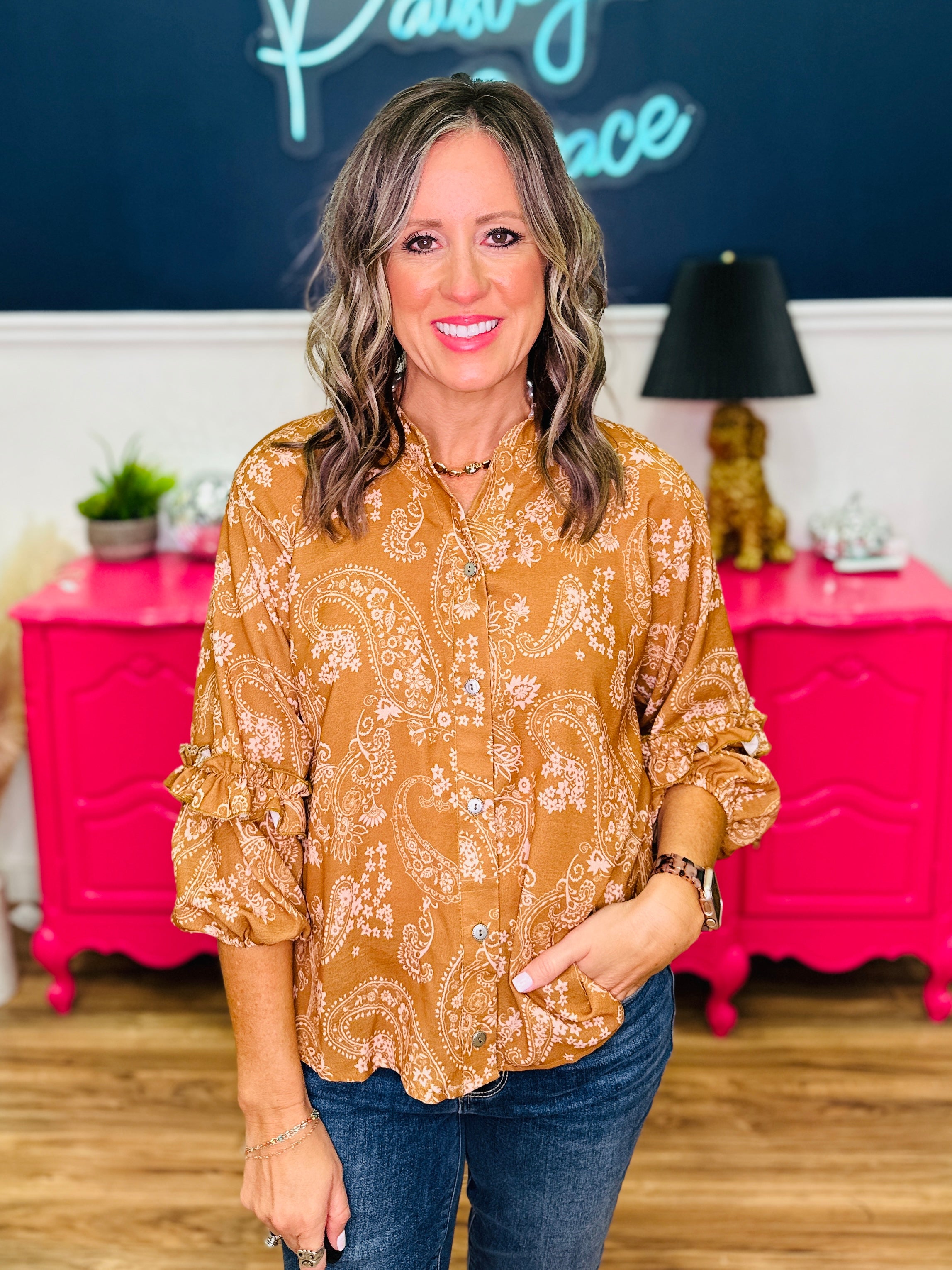 Bring on the boho vibes with this long sleeve paisley top! The flowy fit and timeless print make it effortlessly stylish and easy to wear. Pair it with jeans or trousers for a look that’s perfectly polished yet relaxed.