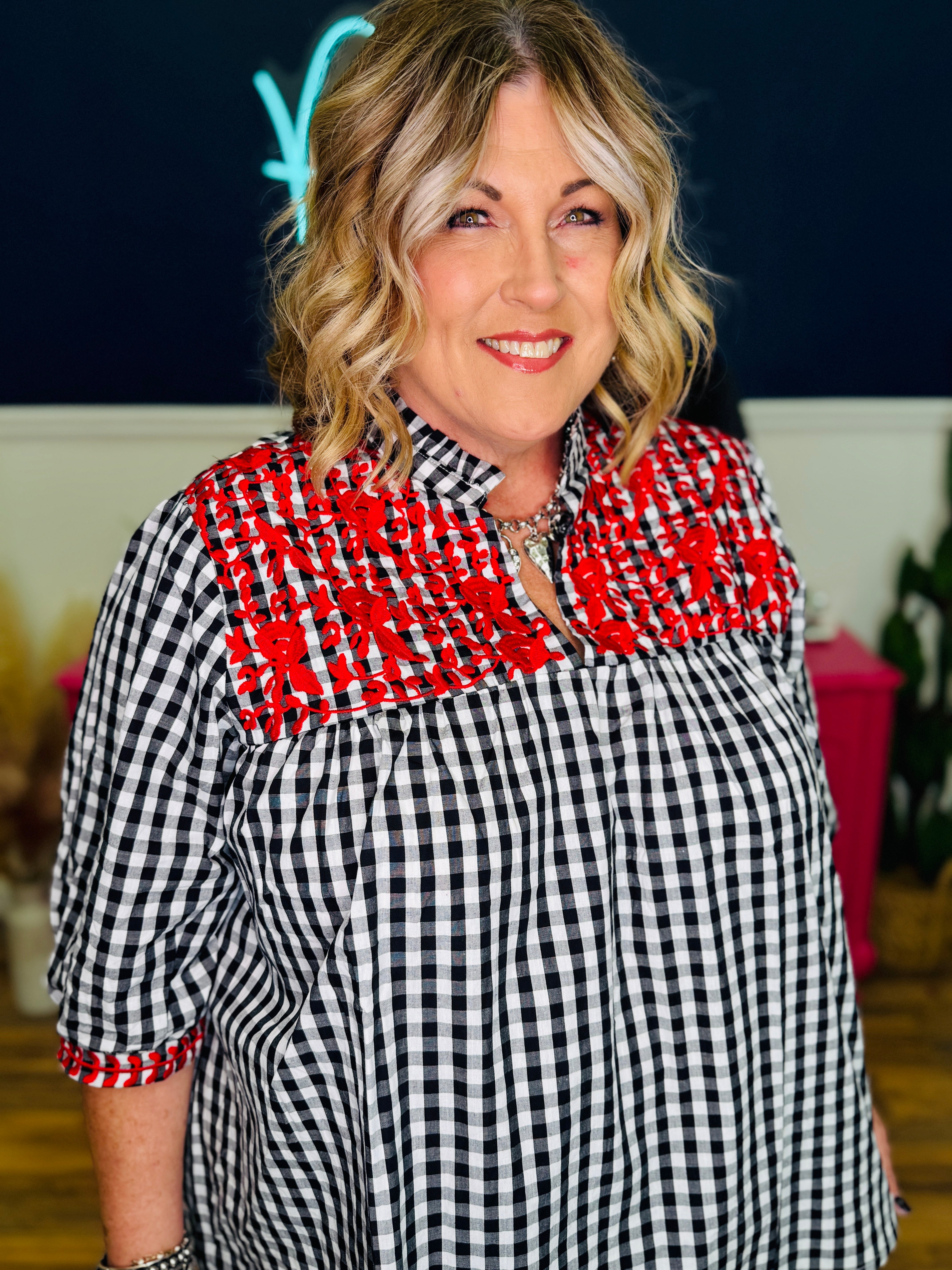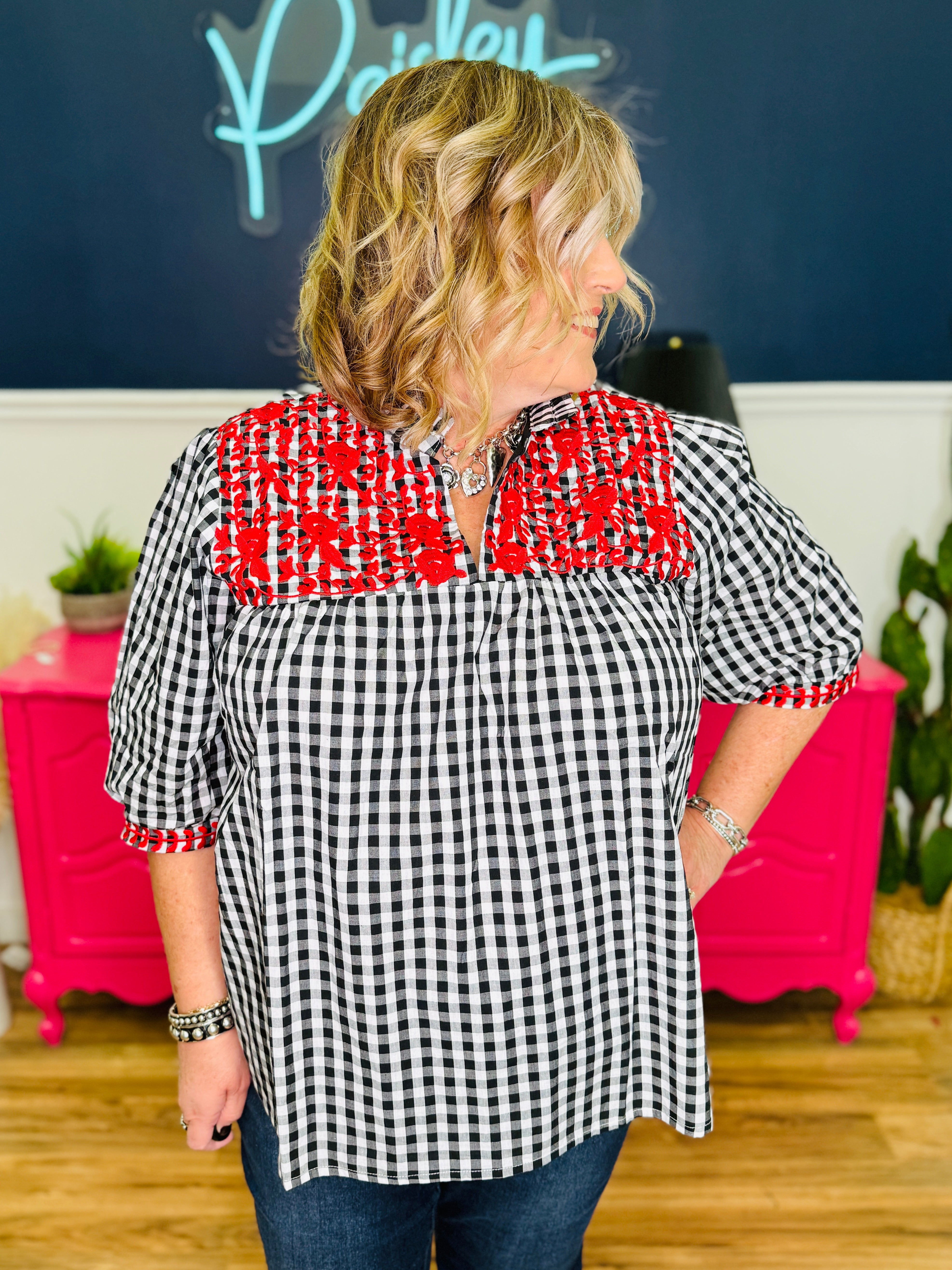 - Black & White Plaid w/ Red Embroidered
