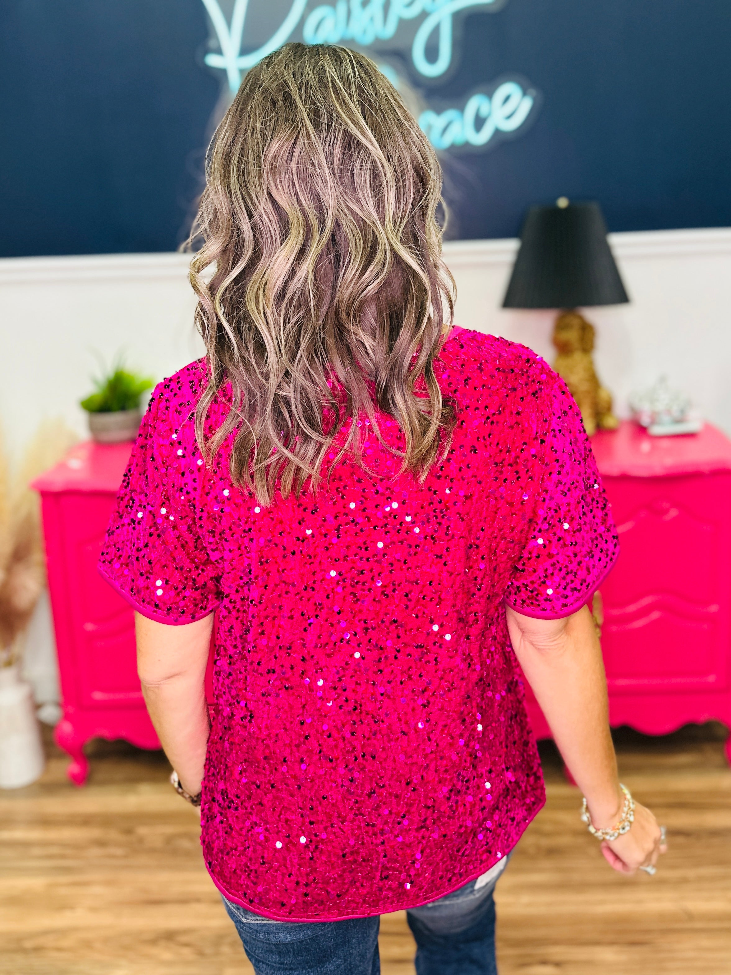 Shine all day (and night) in this dazzling sequin top! Covered in sparkles with a relaxed fit and short sleeves, it’s the perfect mix of glam and easy comfort. Pair it with denim for a fun daytime vibe or dress it up for a night out that’s sure to sparkle.