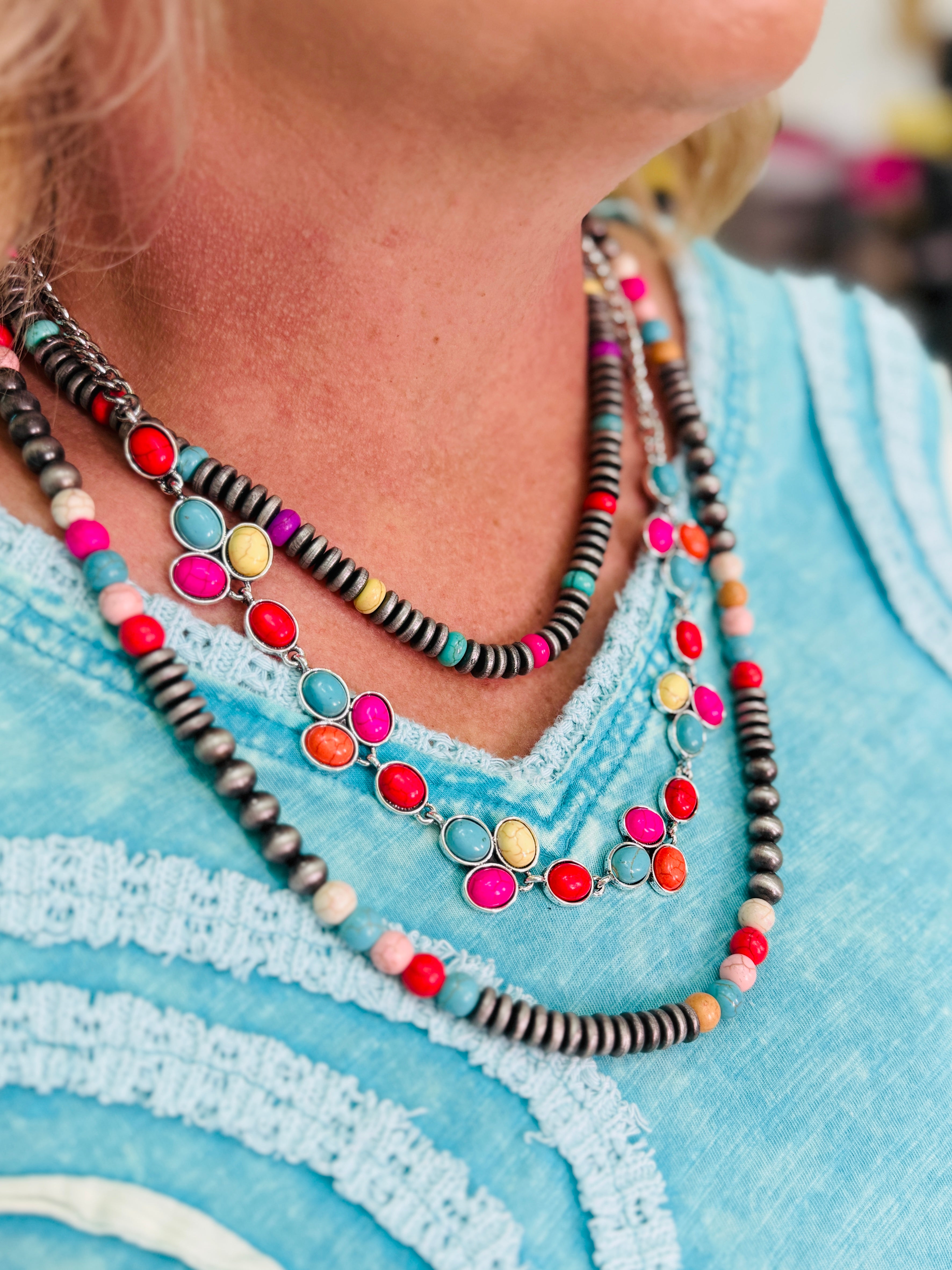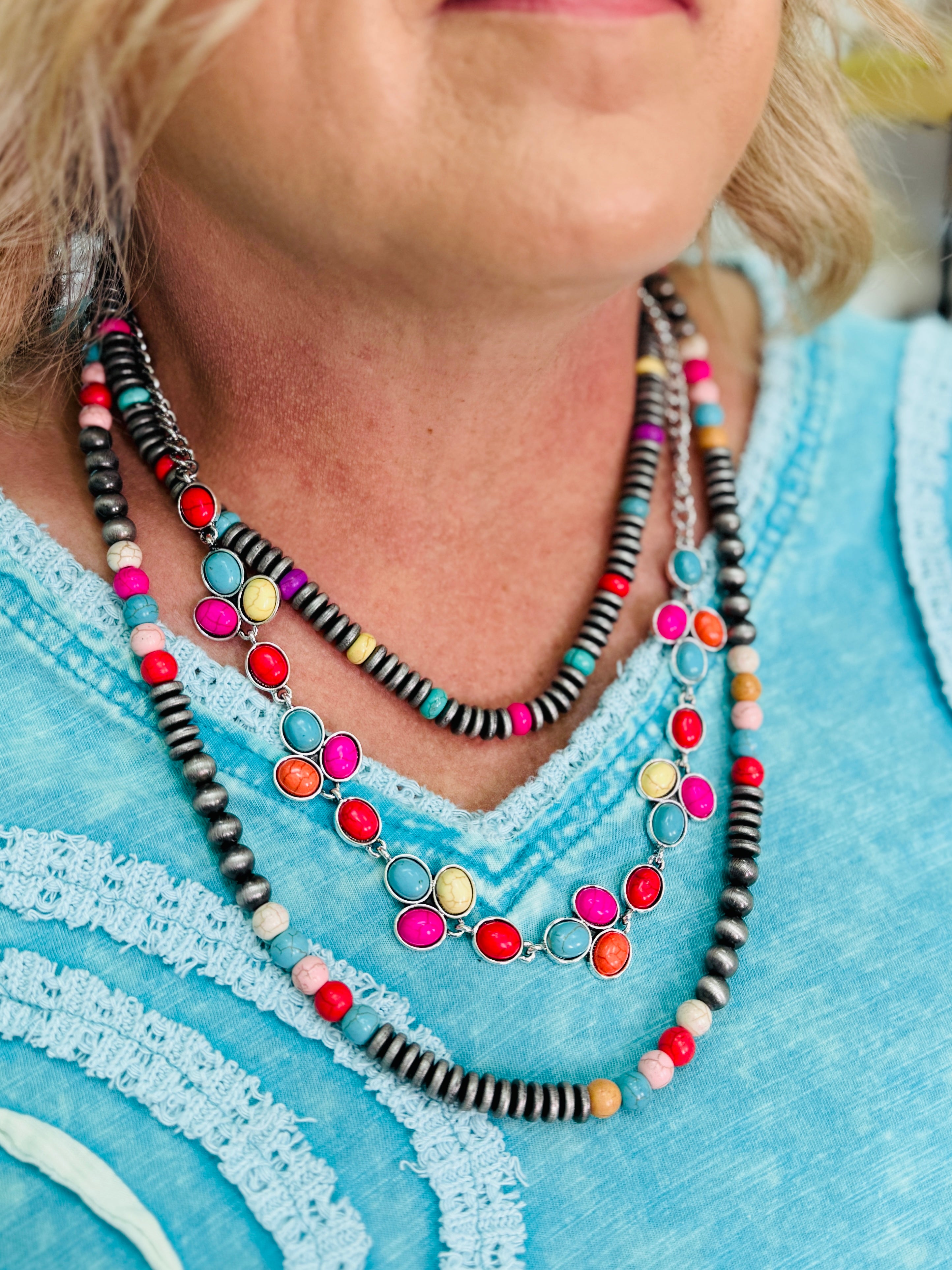 Featuring a Western inspired layered necklace comprised of navajo and multicolored beads.