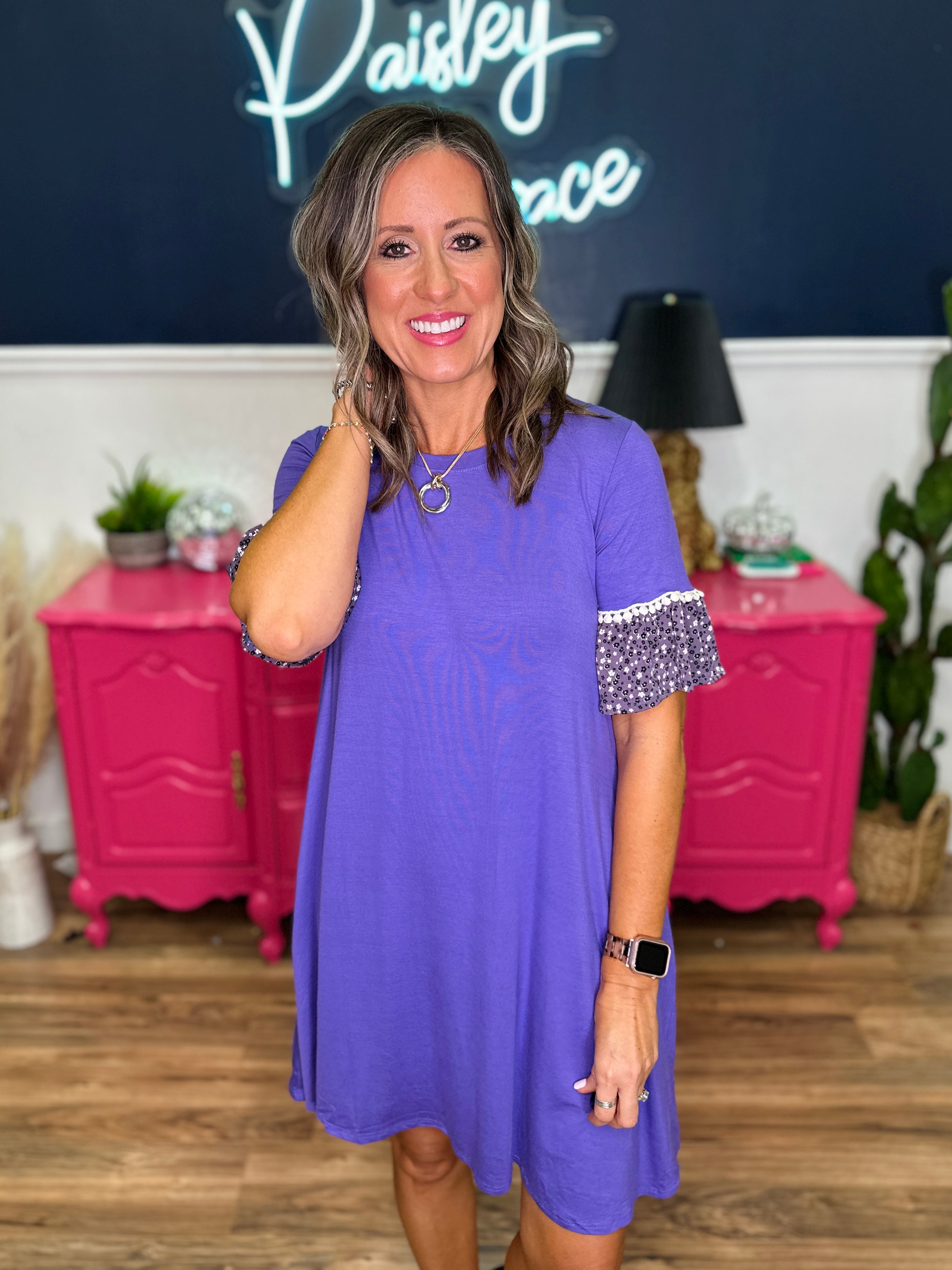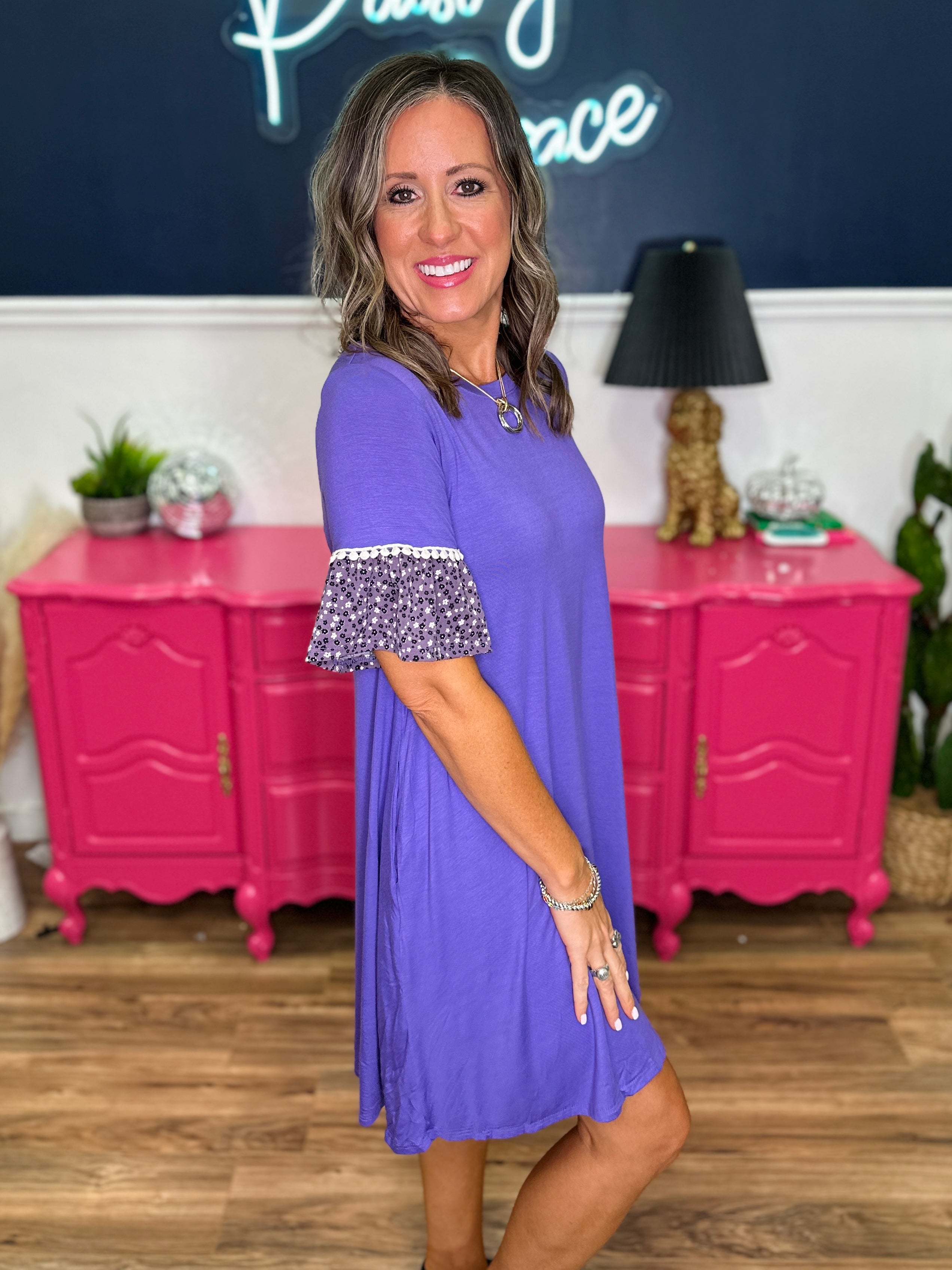 • Round Neckline | Short Flutter Sleeves | Straight Hemline