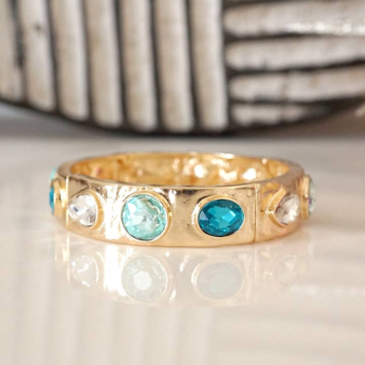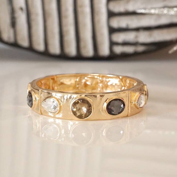 Add a touch of seasonal sparkle with this playful gold-tone bangle. Featuring faceted teardrop, round, and oval crystals, it shines with an organic textured finish. The stretchy design ensures a comfortable fit for most wrists, making it perfect for stacking and mixing to brighten any outfit.