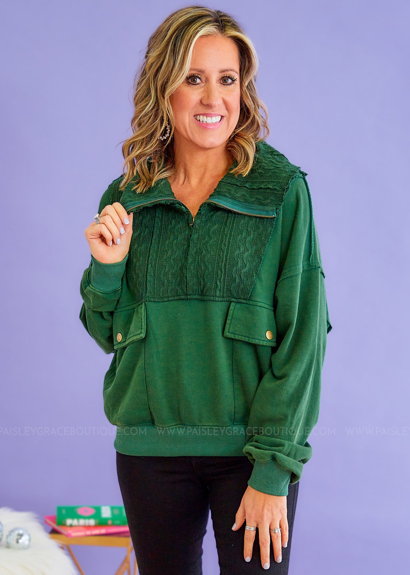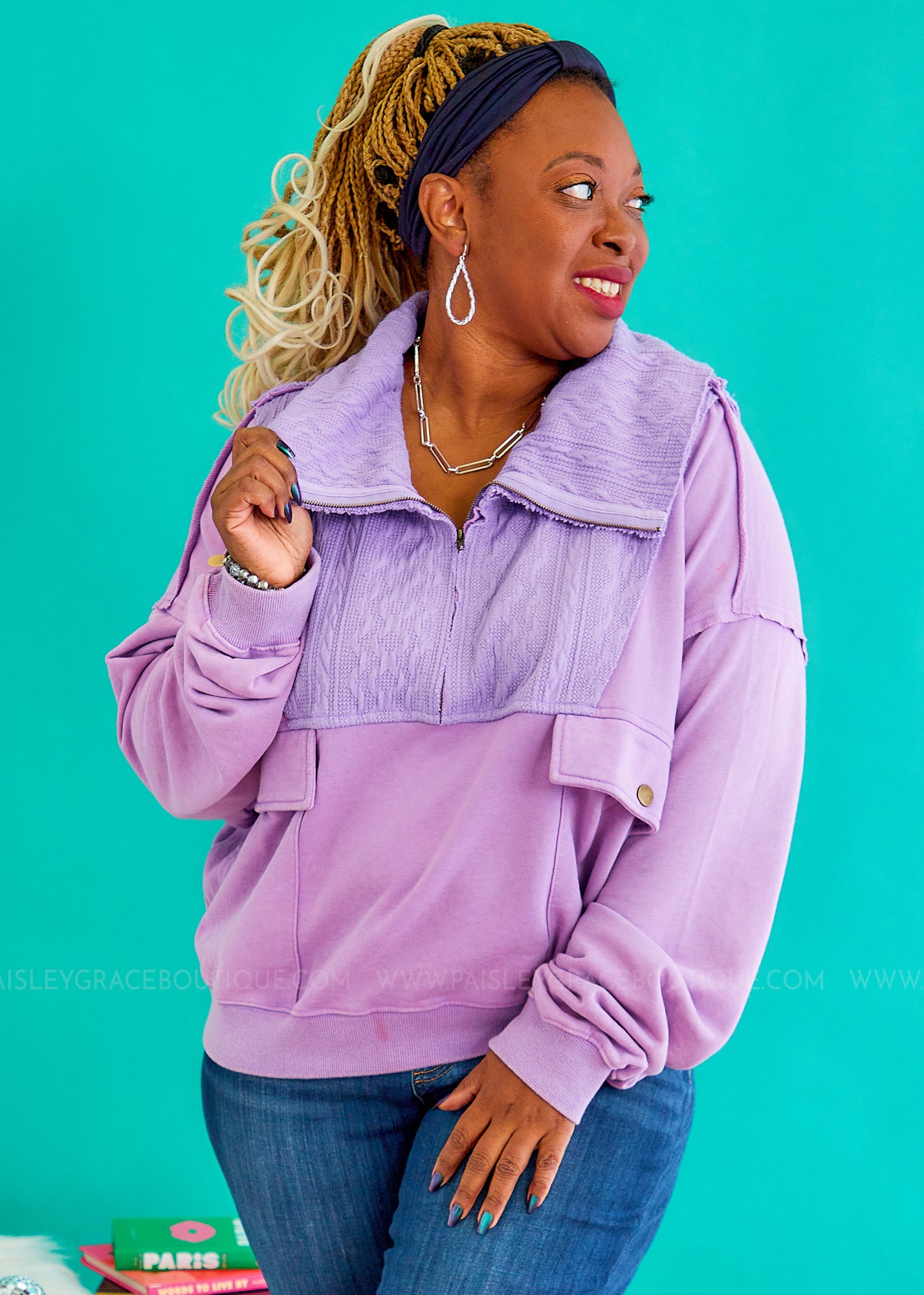 Zipper neckline relaxed fit sweatshirt featuring front pocket, long sleeve with ribbed cuff and bottom hem.