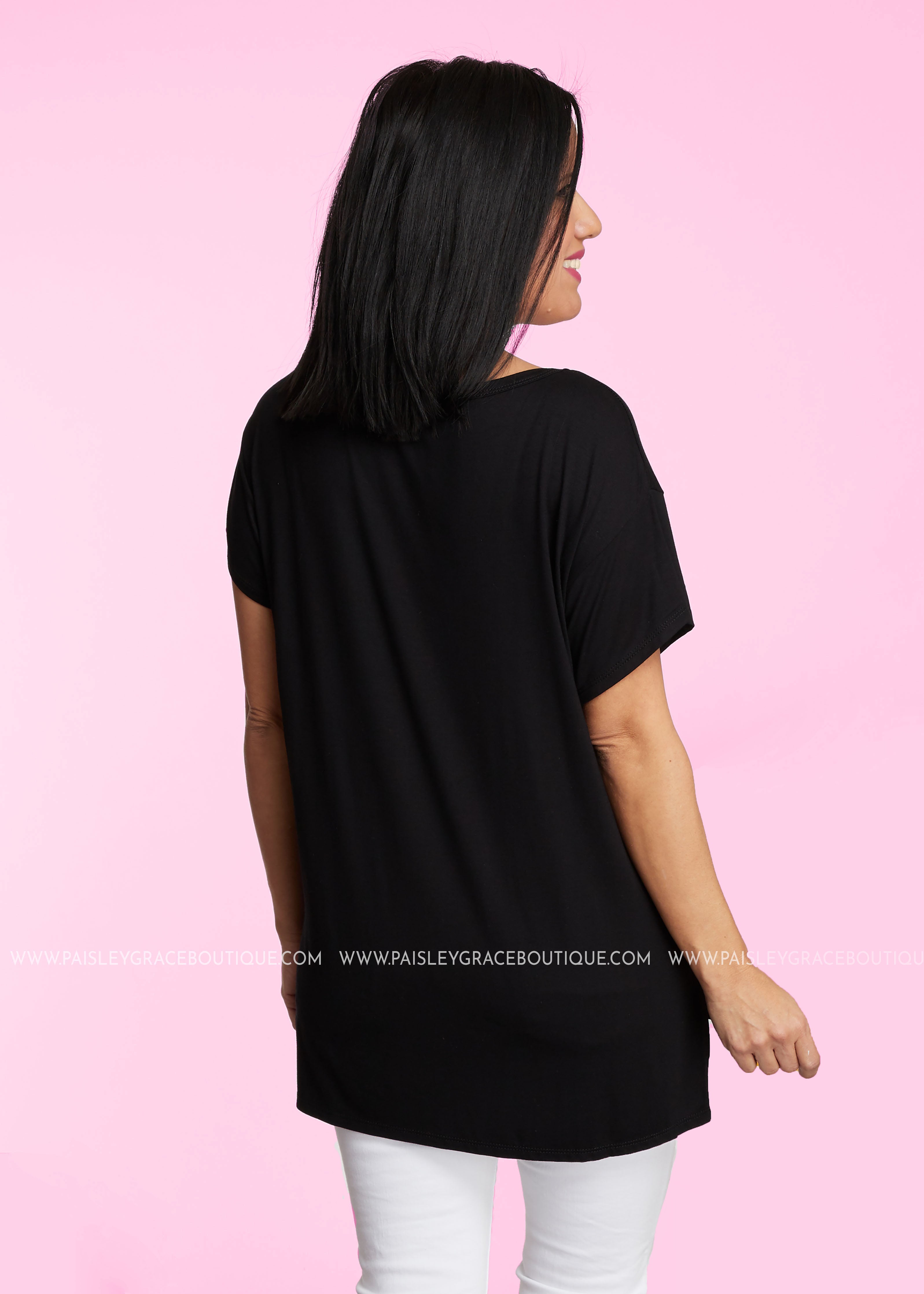 - Scoop Neckline; Loose Short Sleeves; Square Hi-Lo Hemline